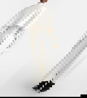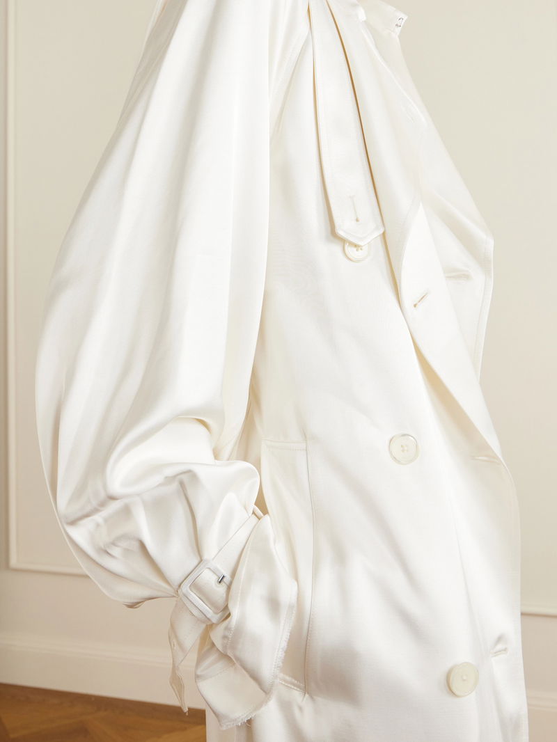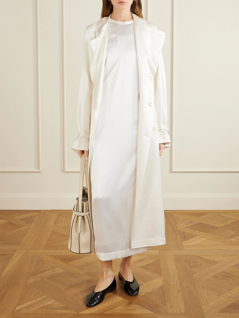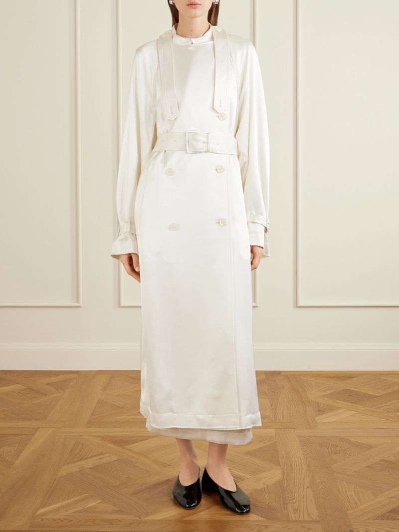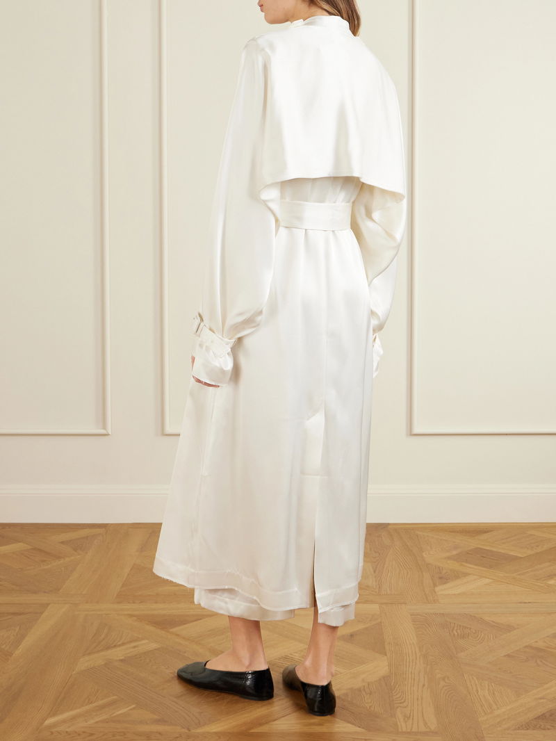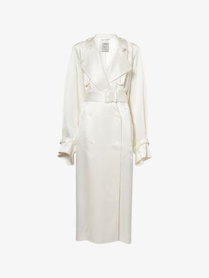 We love TOTEME's elegant and elevated take on the traditional trench coat. Made from fluid satin with a soft sheen, it's cut with wide lapels, a storm flap and a buckled belt that cinches your waist. Layer it over tonal tailoring or eveningwear.