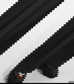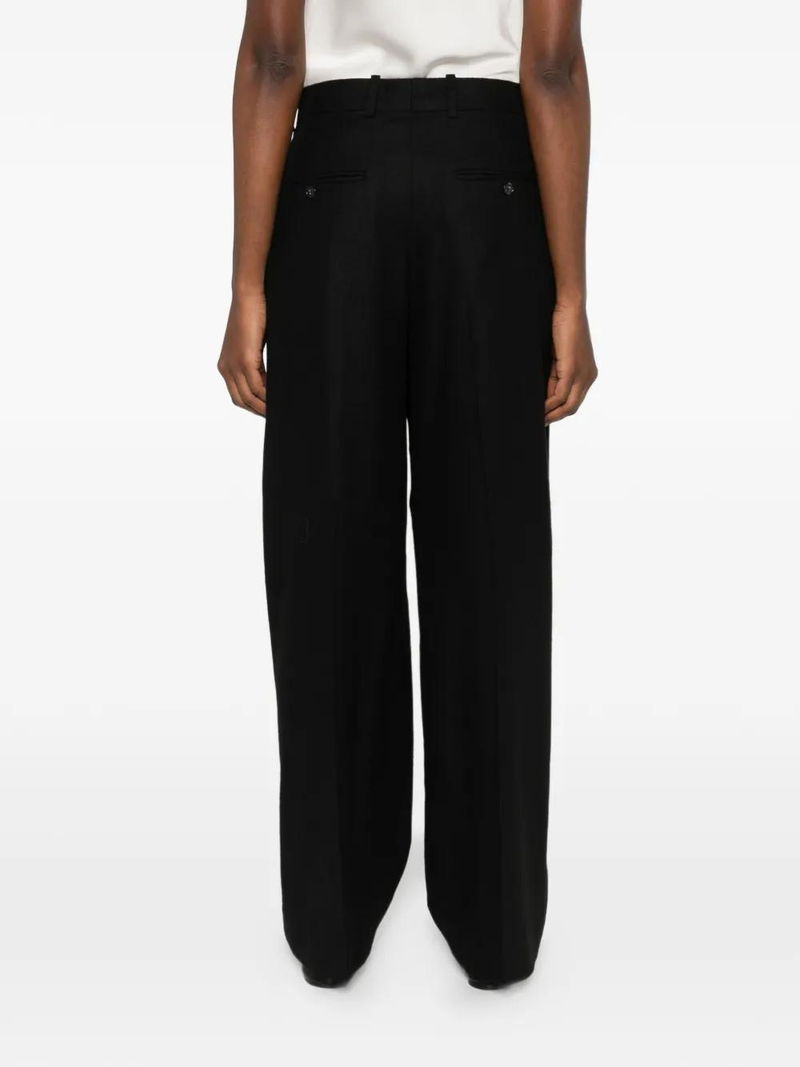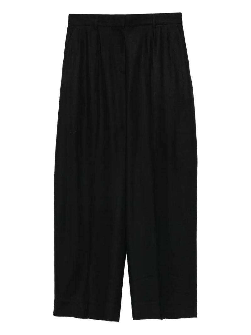 Black, flannel texture, wide leg, pleated front, belt loops, side seam pockets.