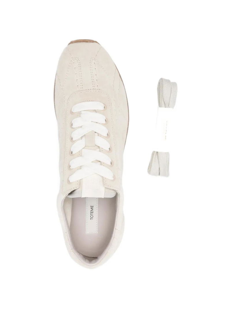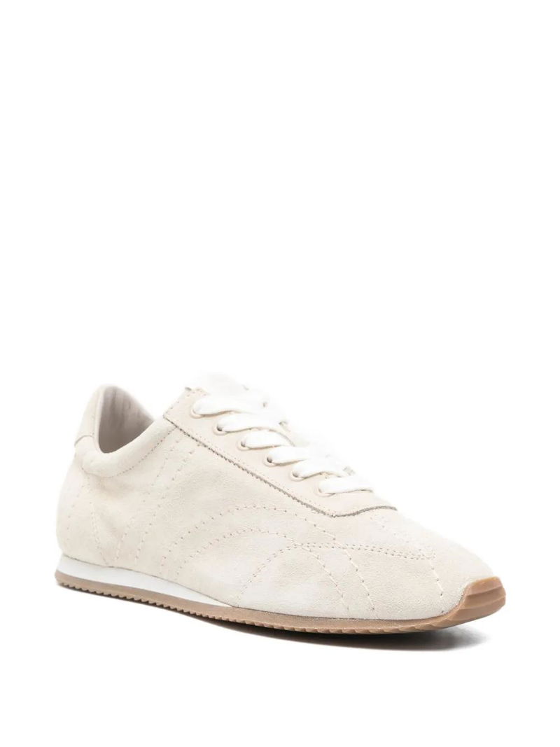 Light grey, suede upper, lace-up fastening, topstitching, logo at rear.