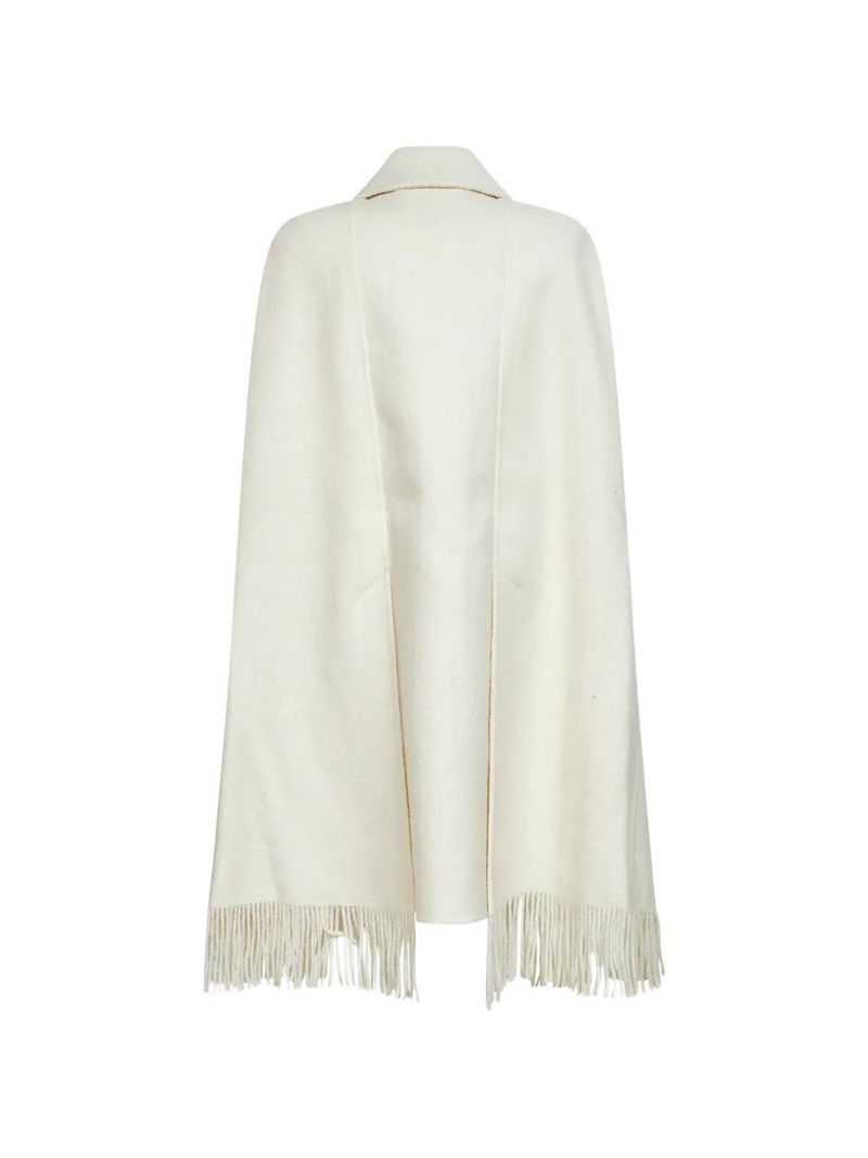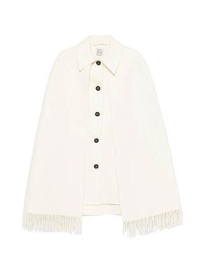Ivory, button placket, fringed hem.