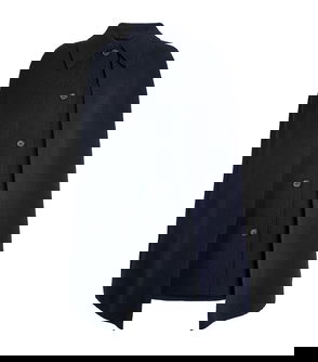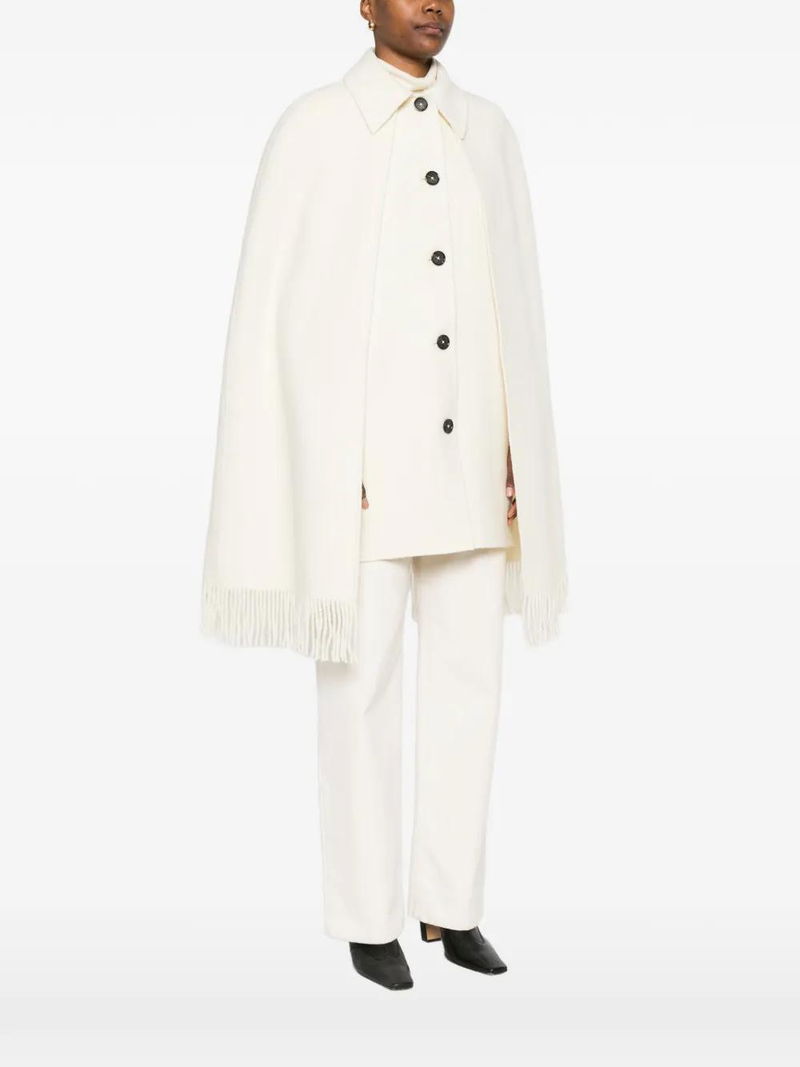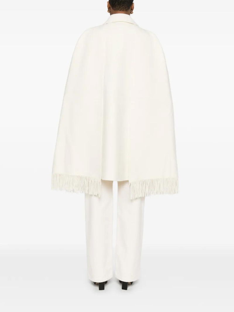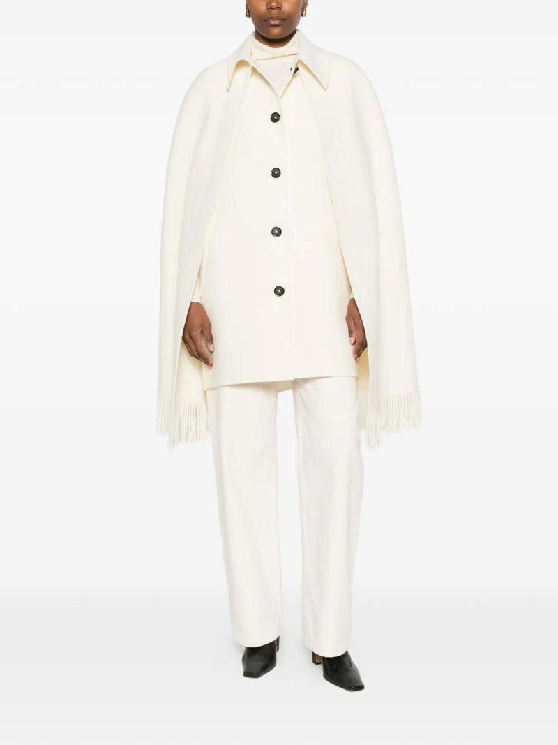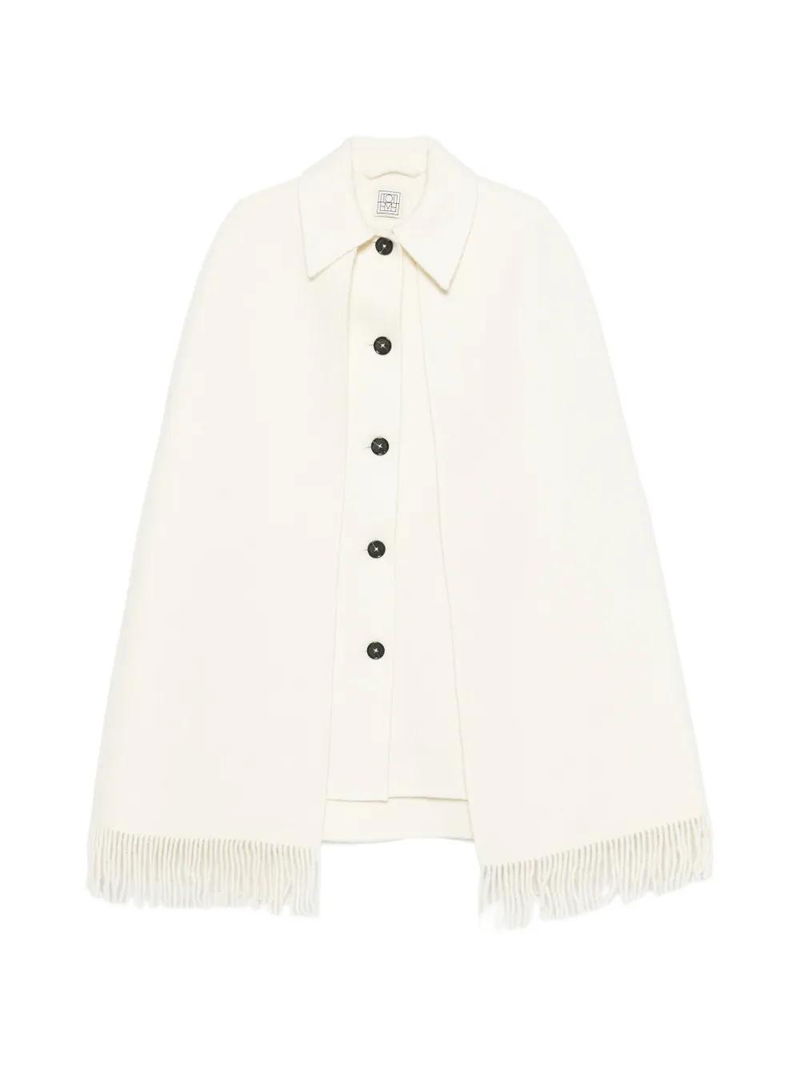 Winter white, button fastening, fringed hem, pointed collar, cape design, relaxed fit.