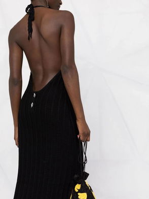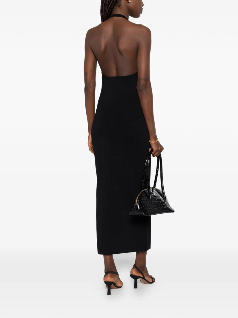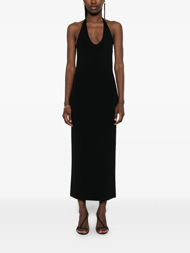 Black halterneck sleeveless straight hem.