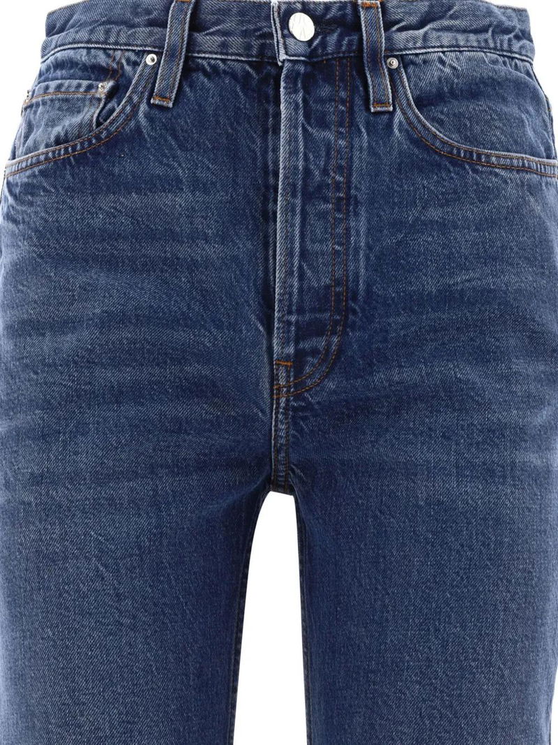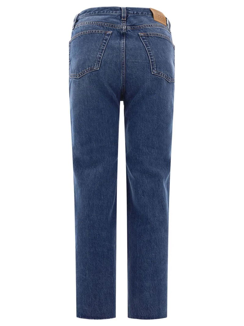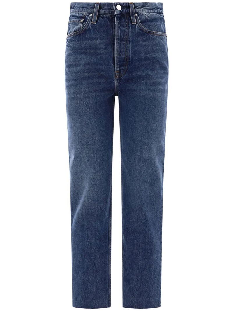 blue cotton denim dark wash washed denim whiskering effect at the thighs logo patch to the rear belt loops high-waisted concealed fly and button fastening classic five pockets straight leg