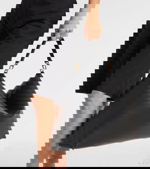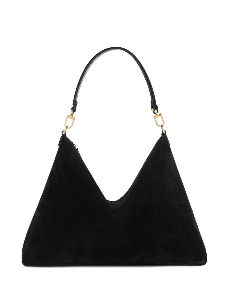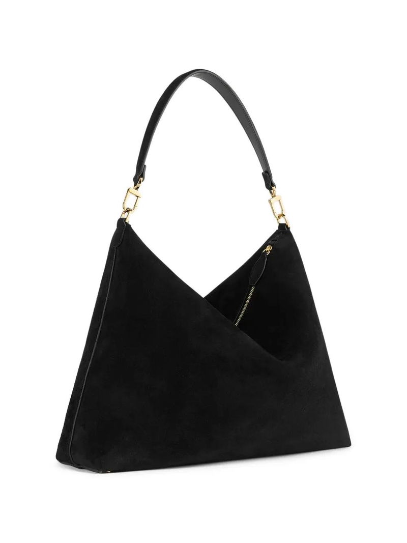 Black suede, top handle, gold-tone hardware, zip fastening, internal slip pocket.