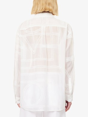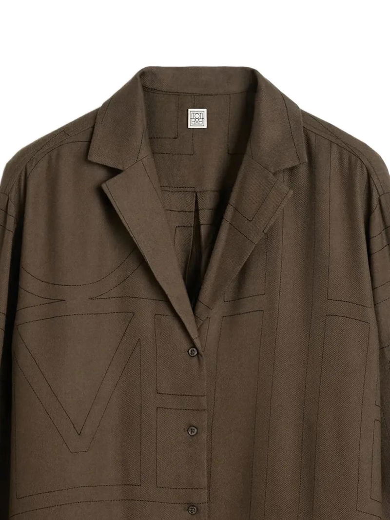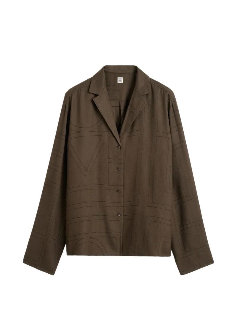 Dark brown, monogram pattern, button fastening, long sleeves, pointed collar, straight hem.