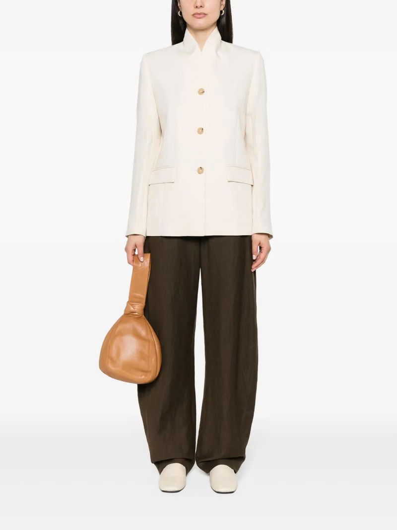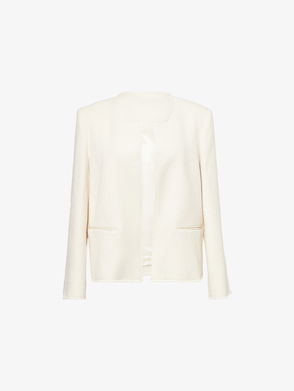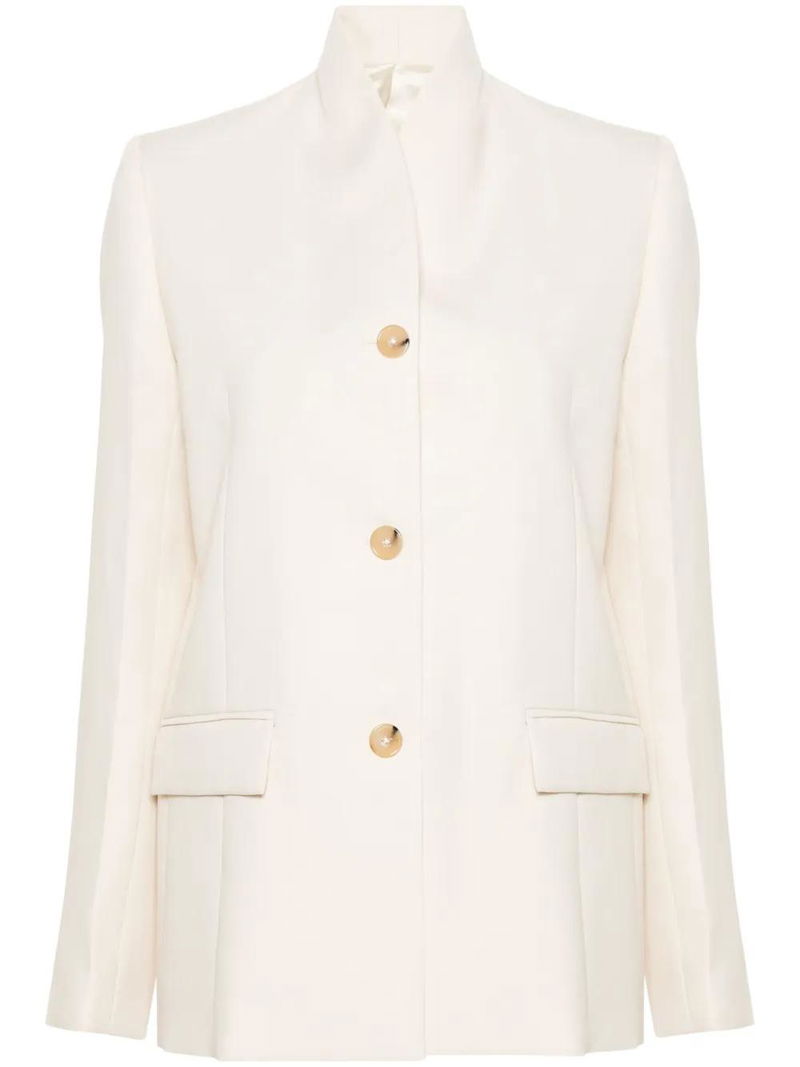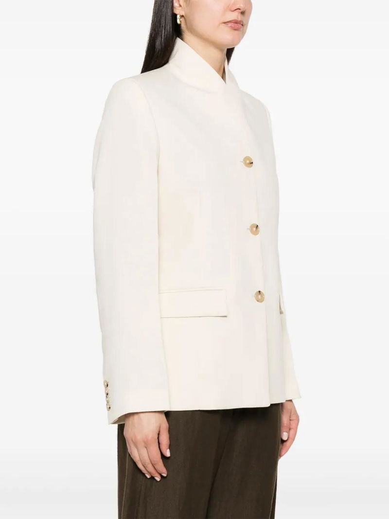 Cream white jersey texture no lapels shoulder pads long sleeves buttoned cuffs two front flap pockets stitched pockets English rear vents satin lining front button fastening.