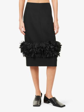 The Petal pencil skirt from Toteme features a wide band of silk petals that mimic the gentle movement of feathers. The piece boasts precise darted construction cut from a wool and silk fabric.