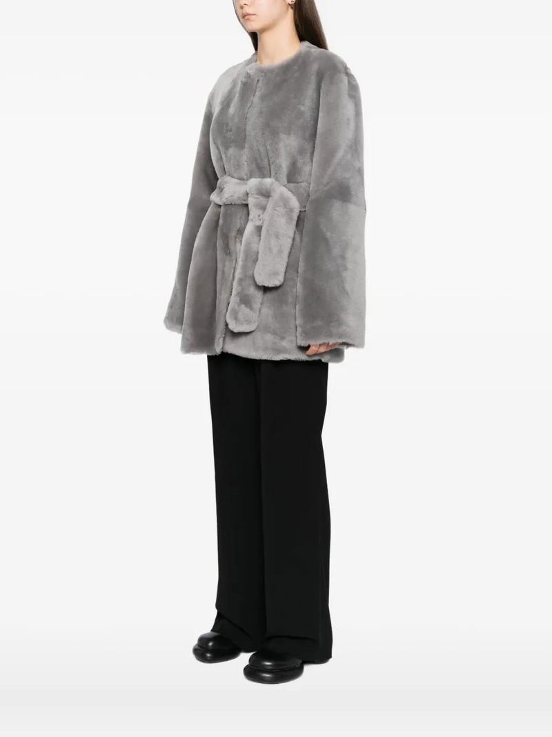 Light grey front hook and eye fastening two side slit pockets detachable and adjustable waist belt belt loops.