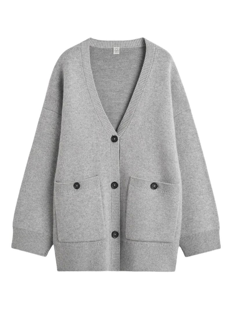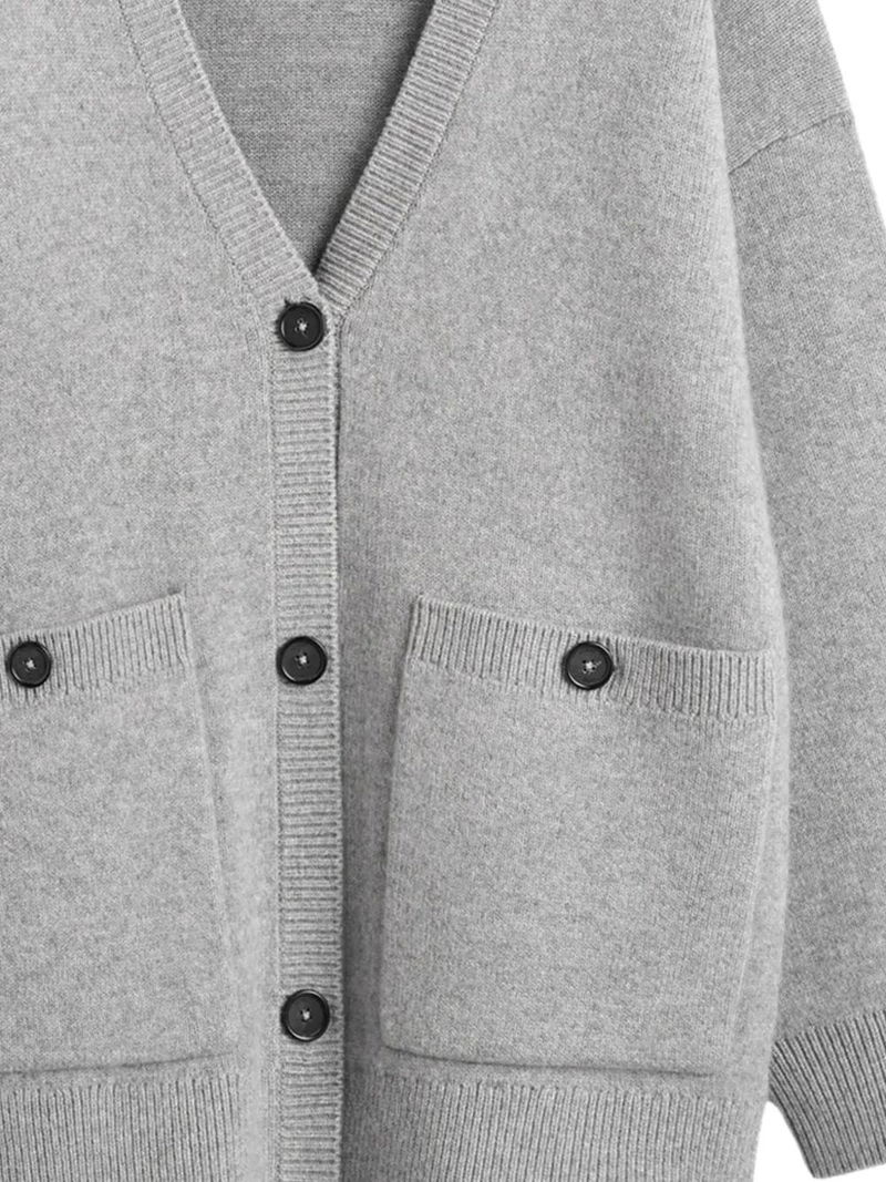 Grey v-neck button fastening patch pockets ribbed cuffs ribbed hem.