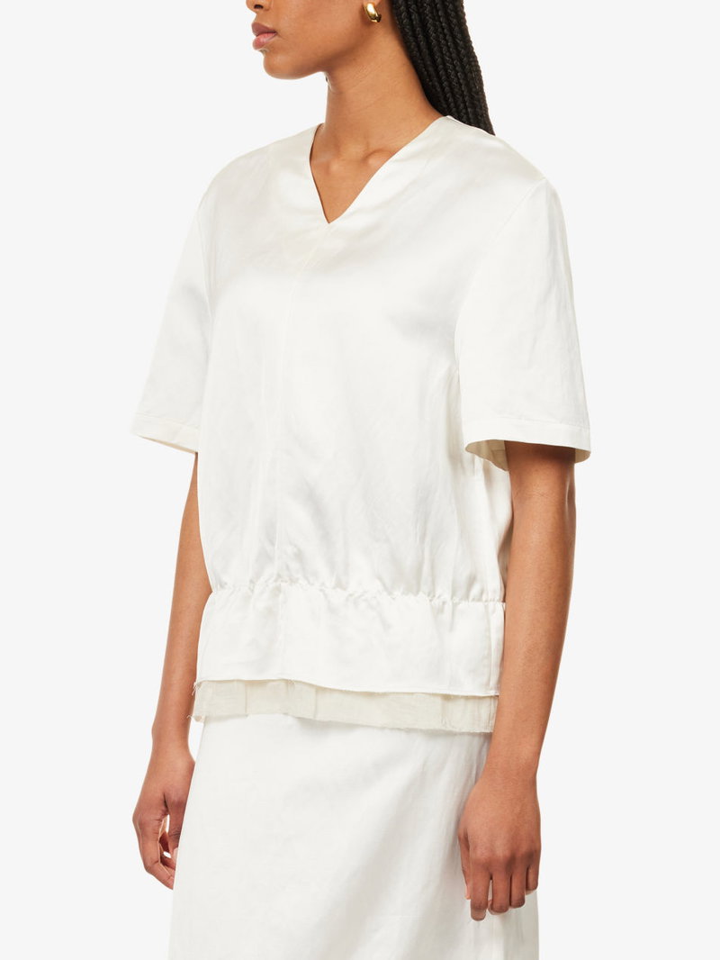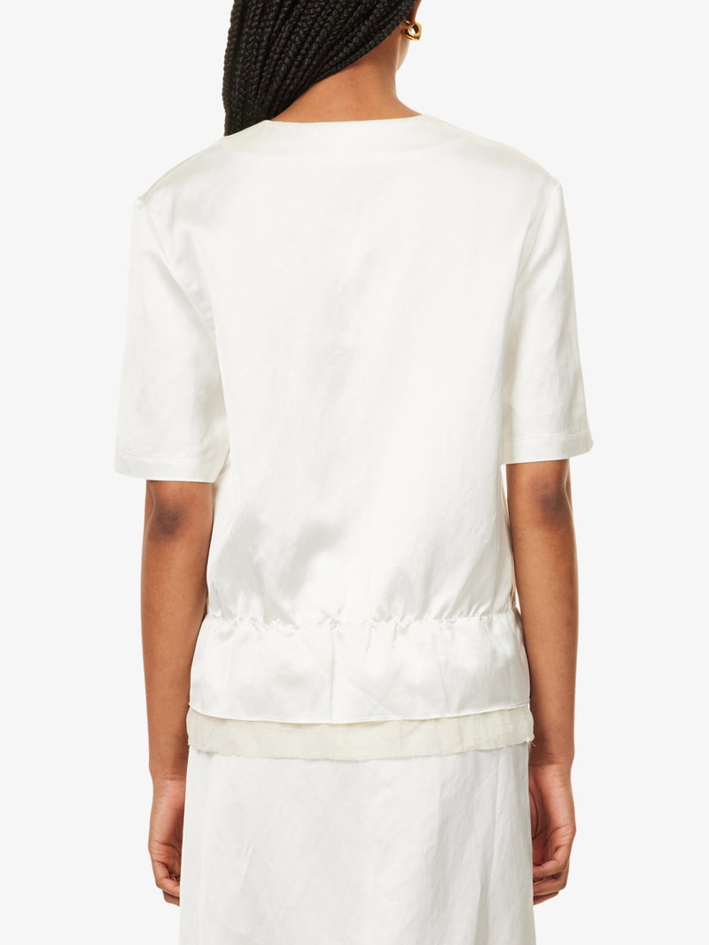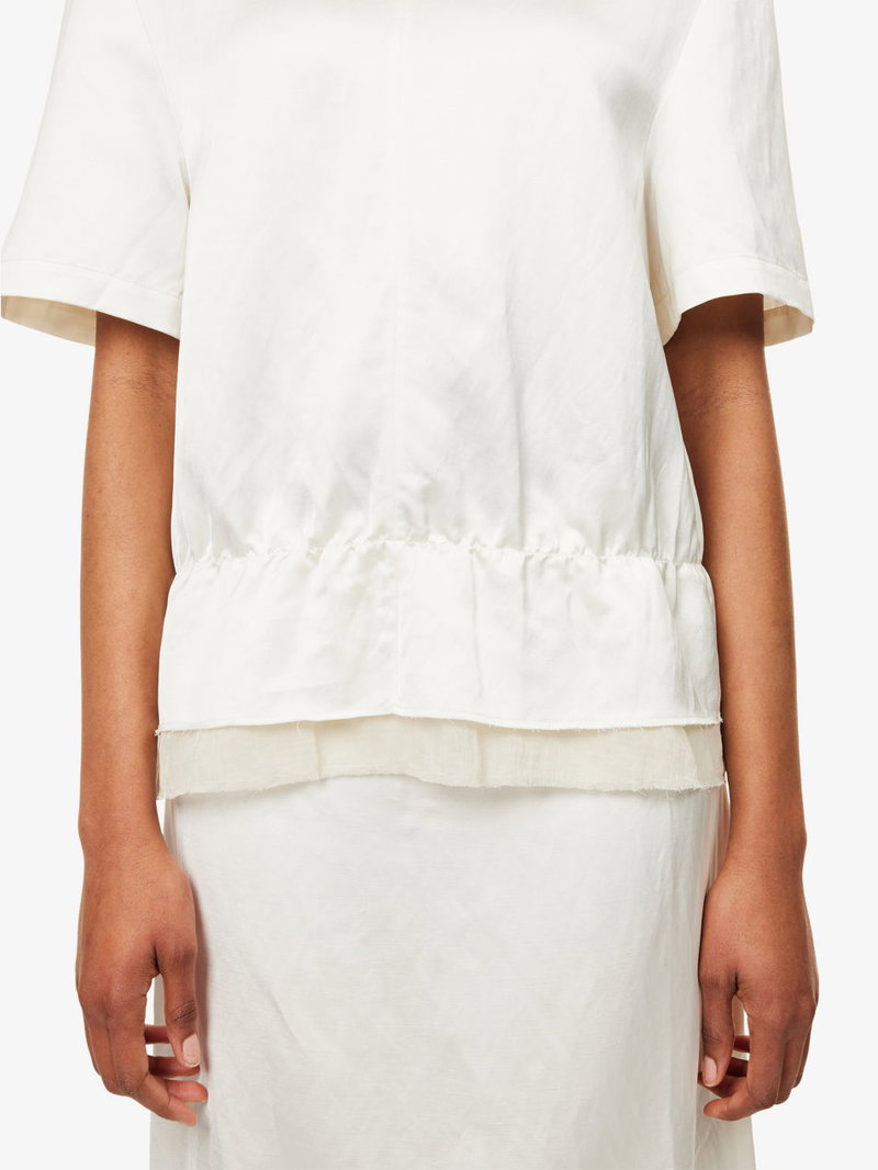 • Relaxed boxy fit, V-neck, short sleeves, layered design, raw trim at hem