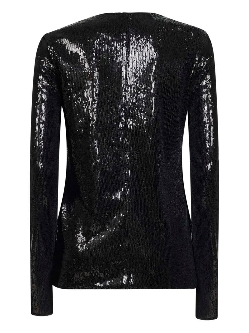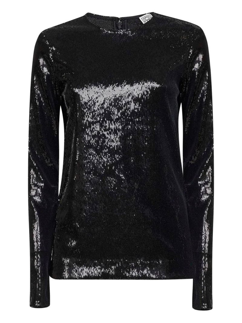 Black sequin embellishment crew neck long sleeves straight hem zip fastening.