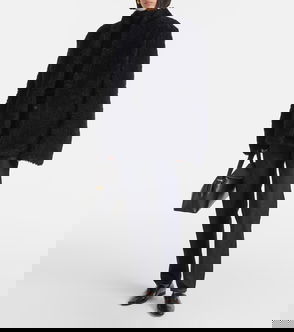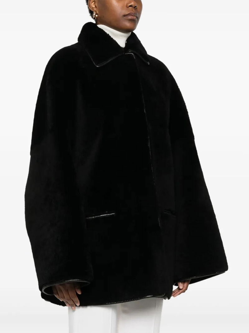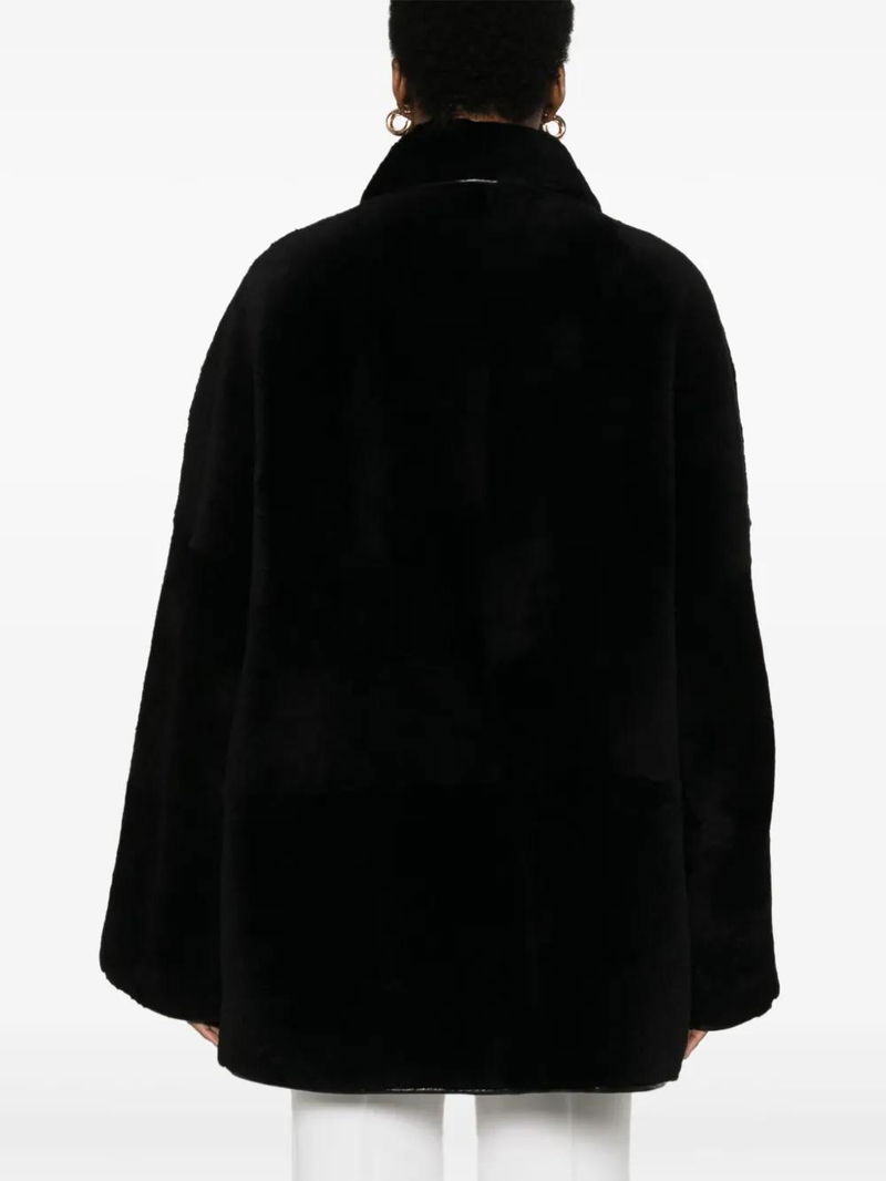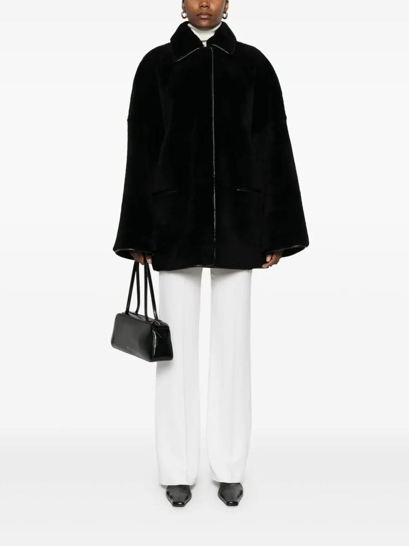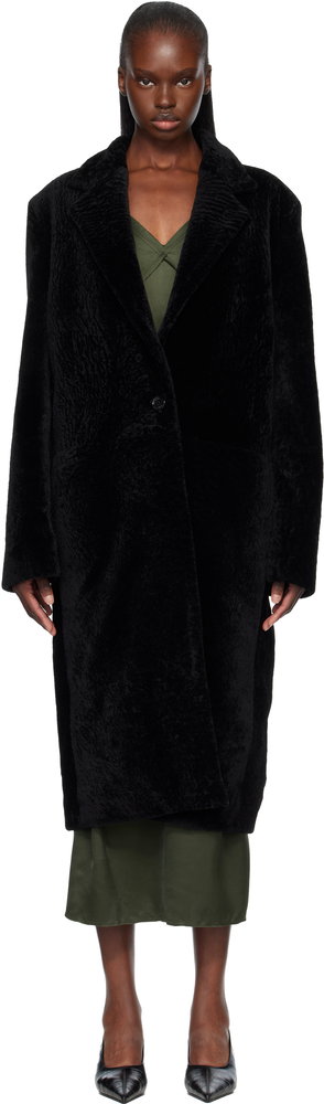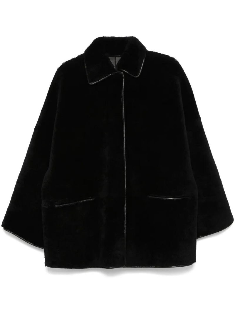 Black shearling concealed press-stud fastening spread collar leather trim long sleeves two front jetted pockets leather lining straight hem.