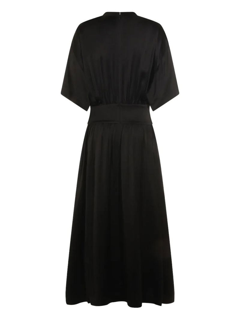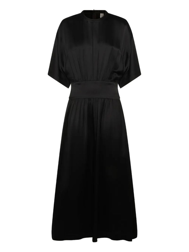Black, short-sleeve, waist detail, round neck, rear zip fastening.