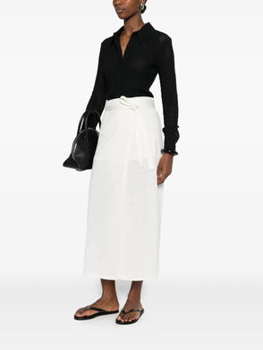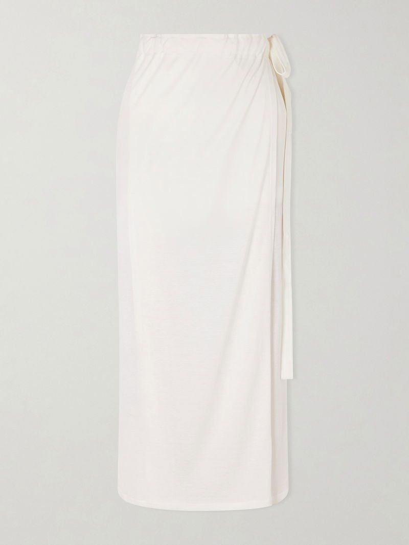 TOTEME elevates everyday essentials with minimalist elegance in this wrap skirt. Crafted from semi-sheer off-white silk and cotton-blend jersey, it has an adjustable fit, soft drape, and sarong-inspired silhouette.