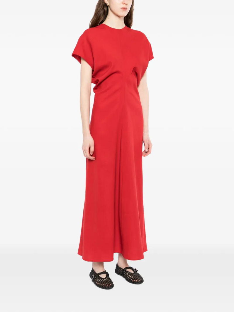 Crimson red, rear hook and zip fastening, crew neck, short sleeves.