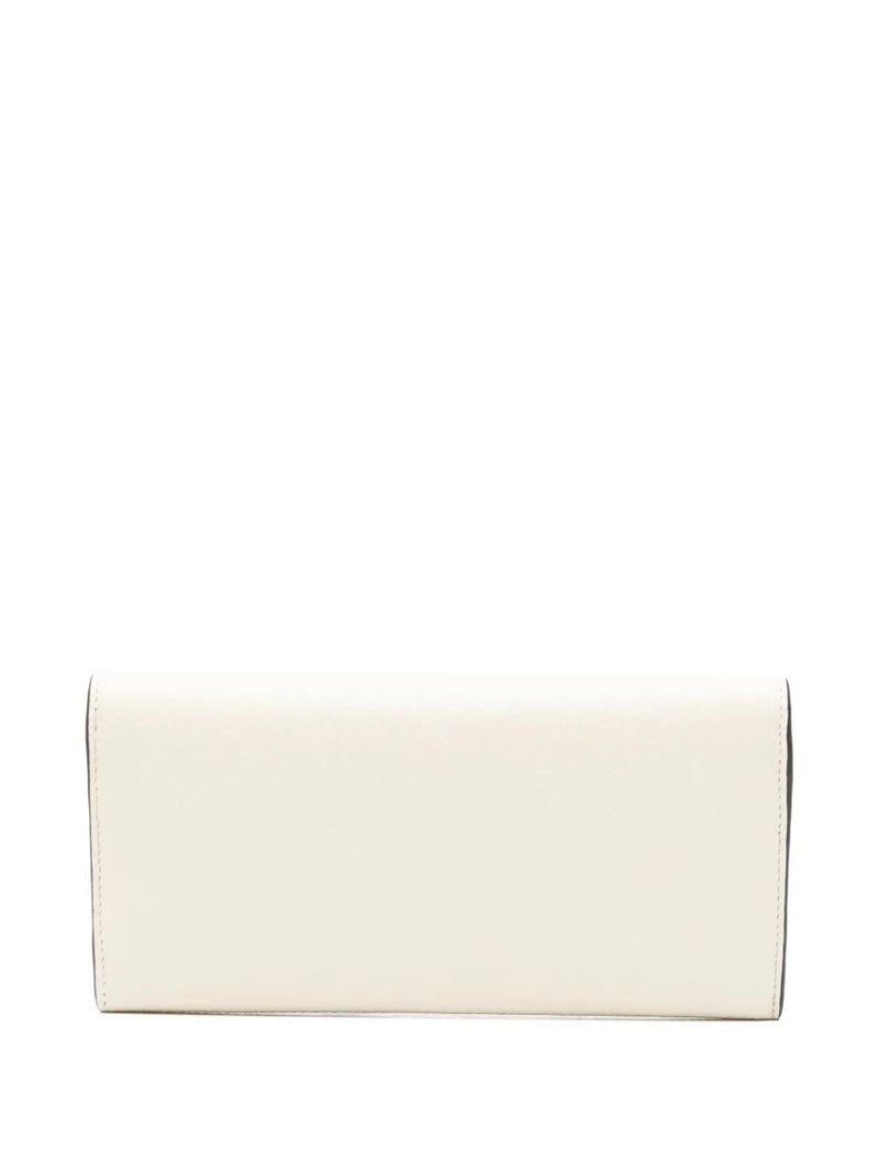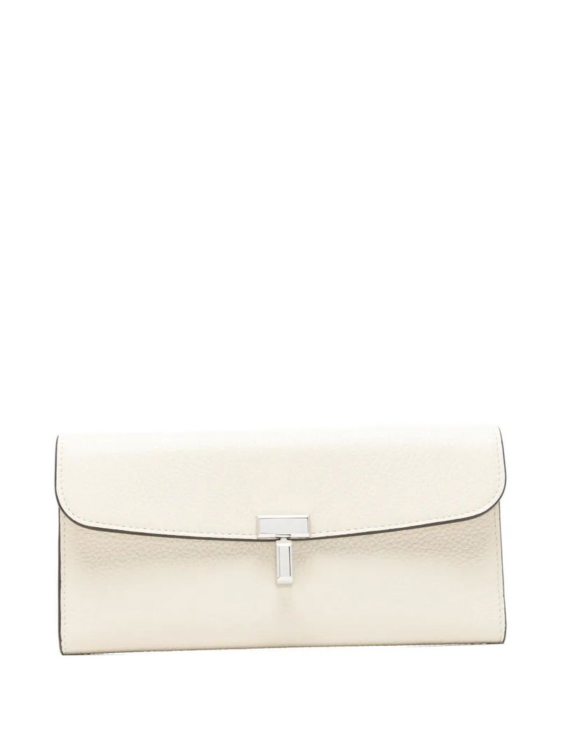 Grained finish, silver-tone hardware, T-lock clasp fastening.