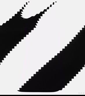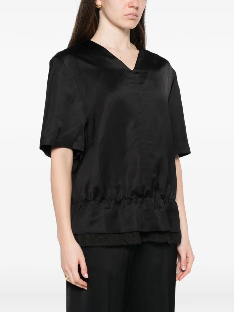 Black V-neck short-sleeved gathered detail ruffled trim.