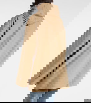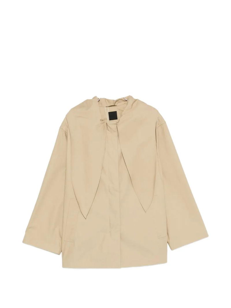 Beige wide sleeves front pockets asymmetric panels concealed closure high neck.