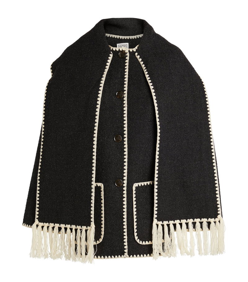 Cut to an oversized silhouette, the outerwear design is imagined with an attached scarf, so you don’t have to worry about carrying one during the colder months – simply throw it over your neck to stay protected from the harsh winds.