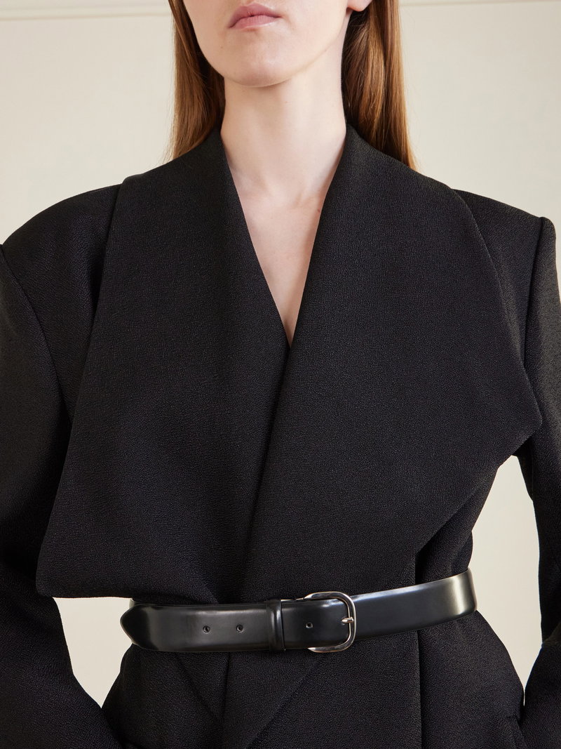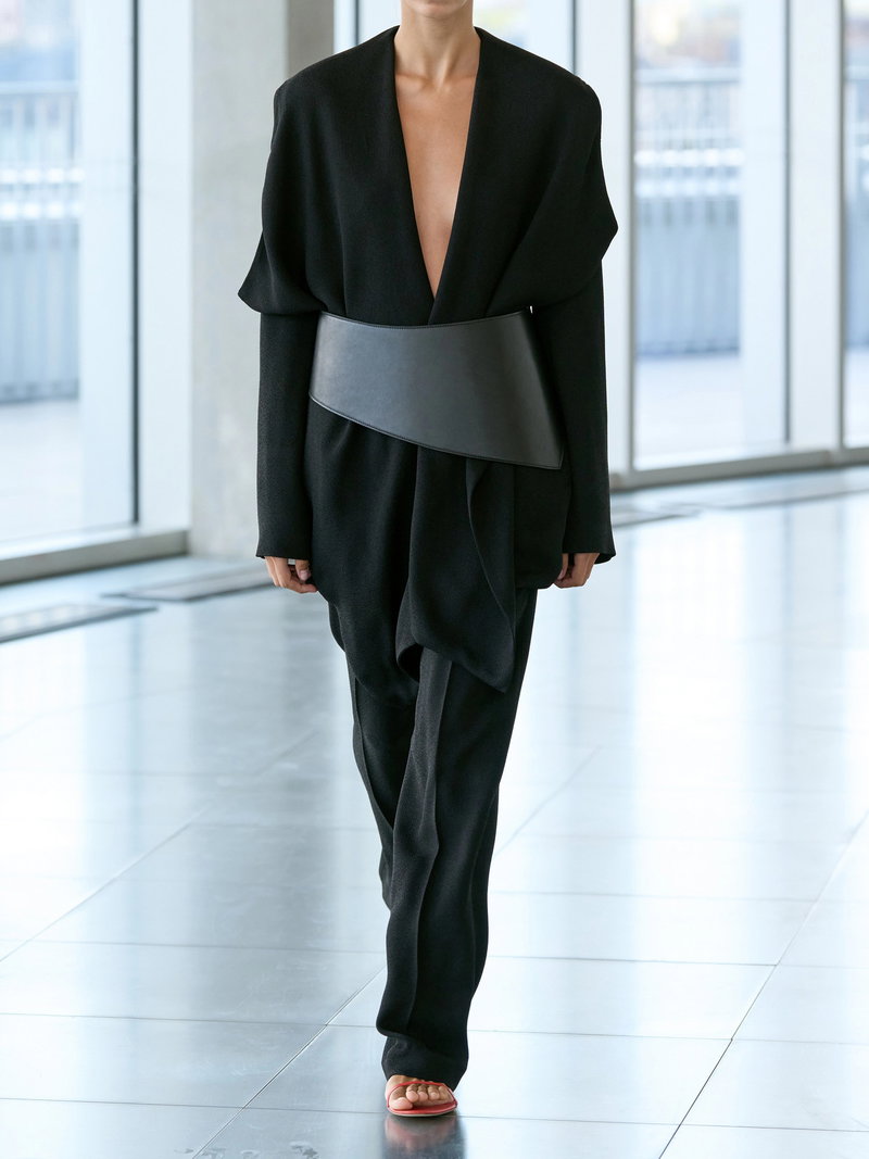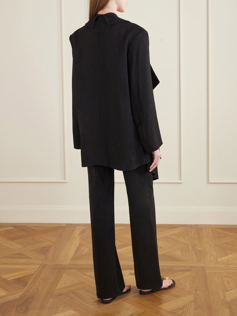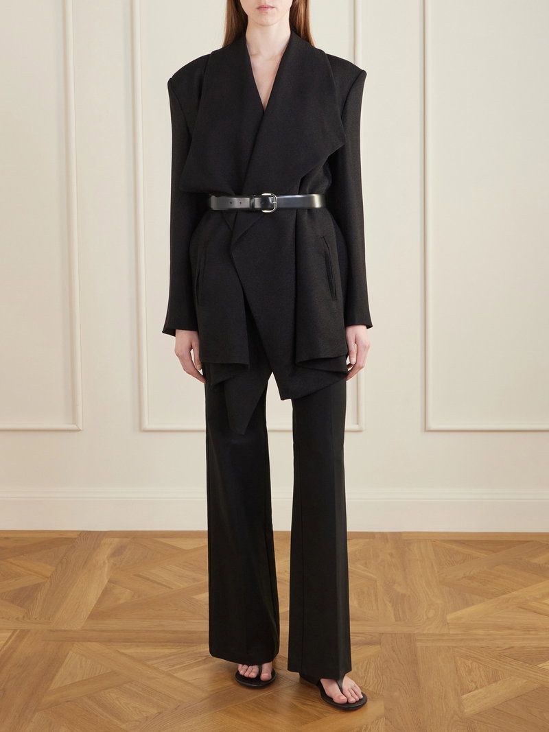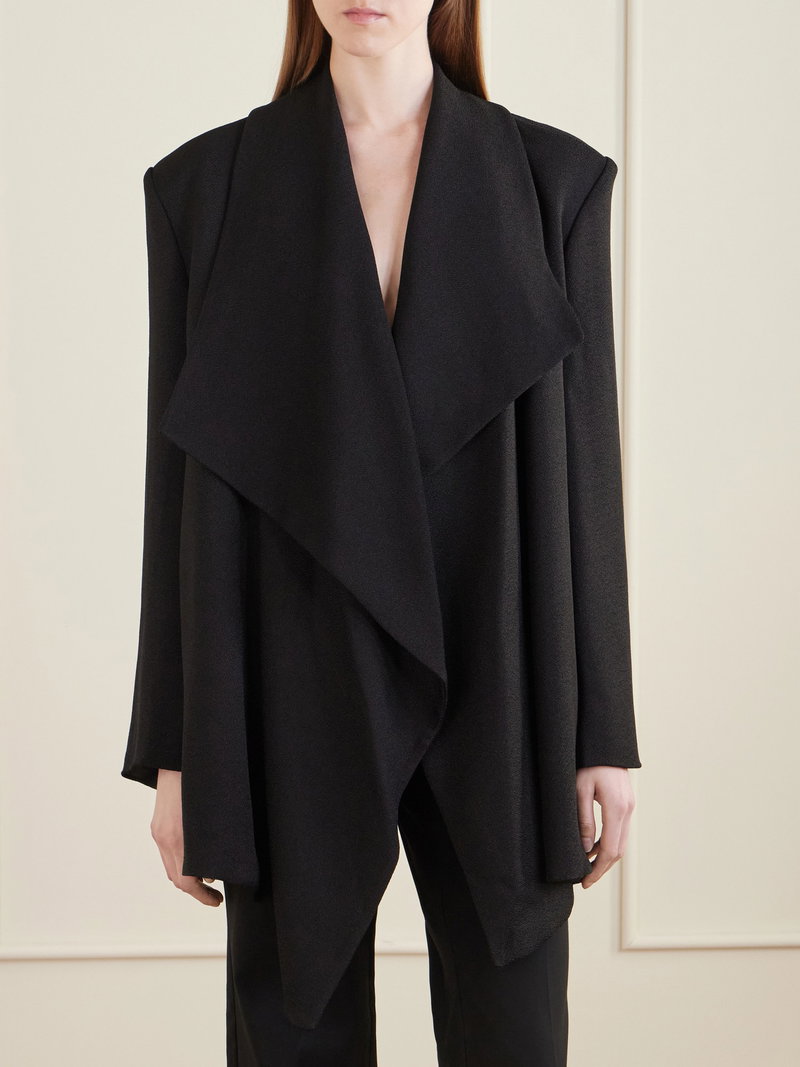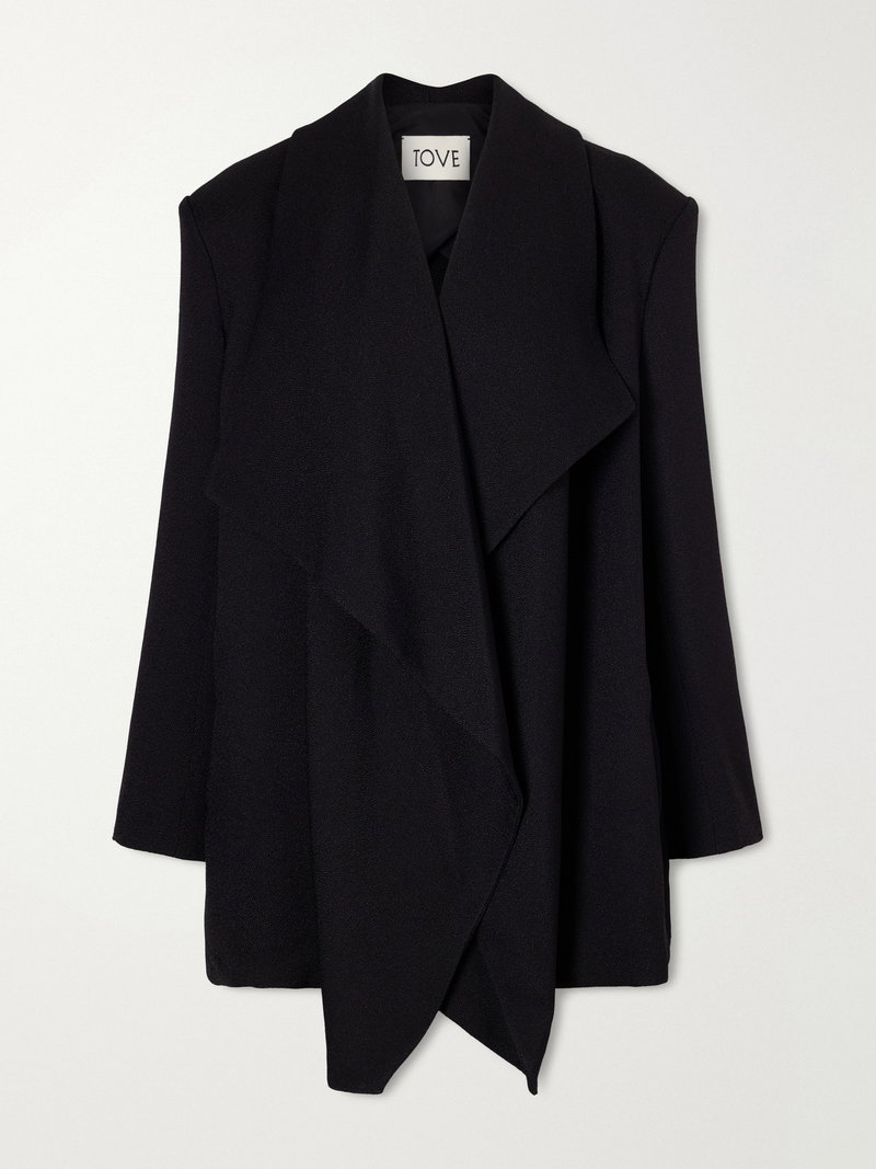 TOVE’s 'Goldie' jacket, as seen on the runway, is draped into a sculptural, open-front silhouette. The softly enveloping shape is balanced by an oversized collar, creating contrast between structure and movement.