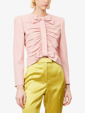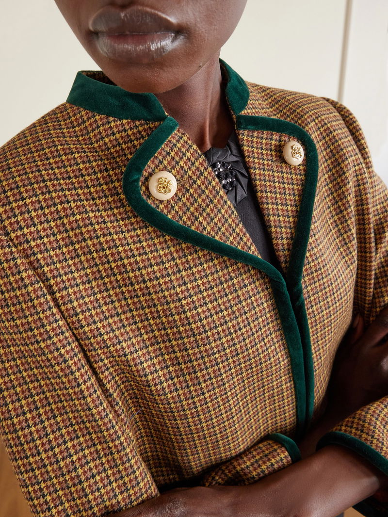 Vintage-inspired glamour is Valentino Garavani's forte. Made from houndstooth wool, this jacket has a boxy, cropped shape trimmed with lustrous velvet. Wear it with gold-tone jewelry to match the ornate buttons.