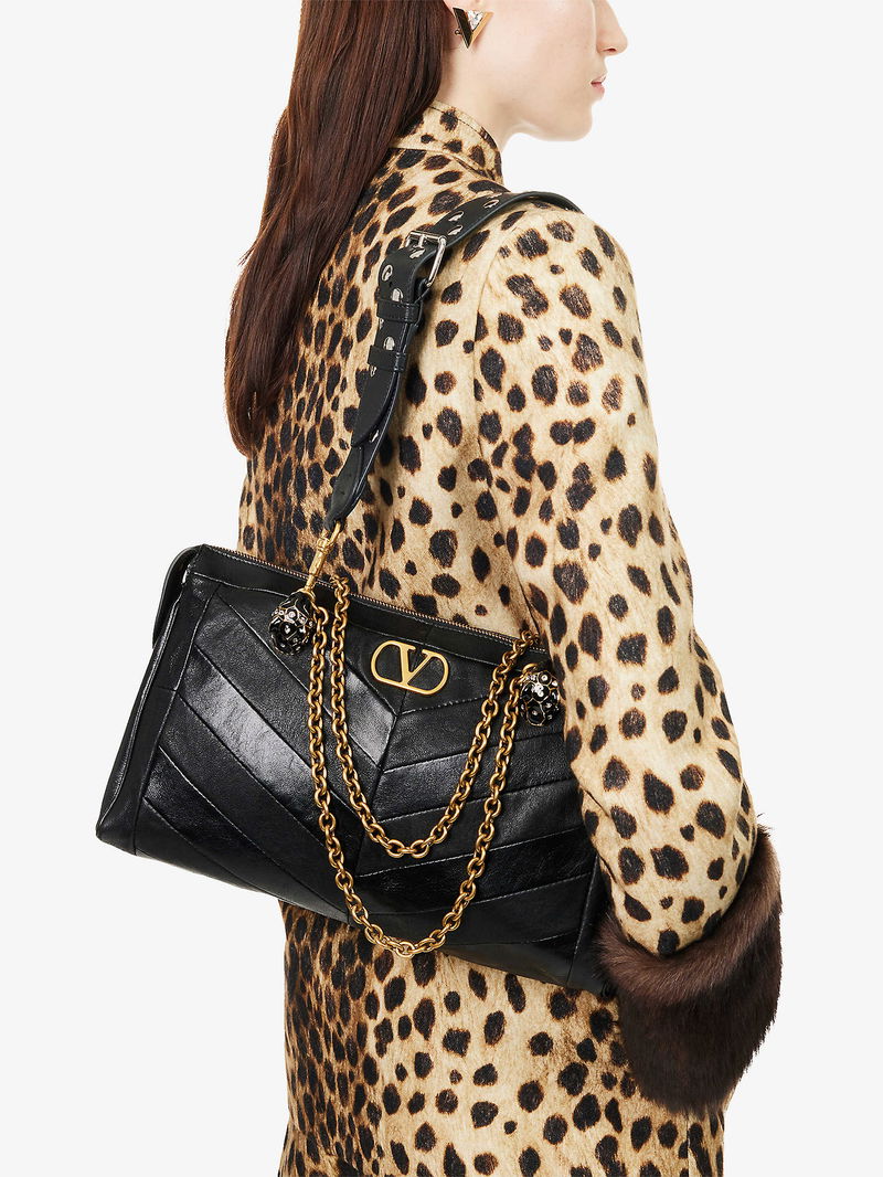 Garavani is better known by his mononym, Valentino. From the signature Rockstud leather shoes to richly embellished dresses, knitwear, tailoring and separates, Valentino Garavani pieces are characterised by a bold and playful use of colour and pattern, with a through line of glamour and luxury.
