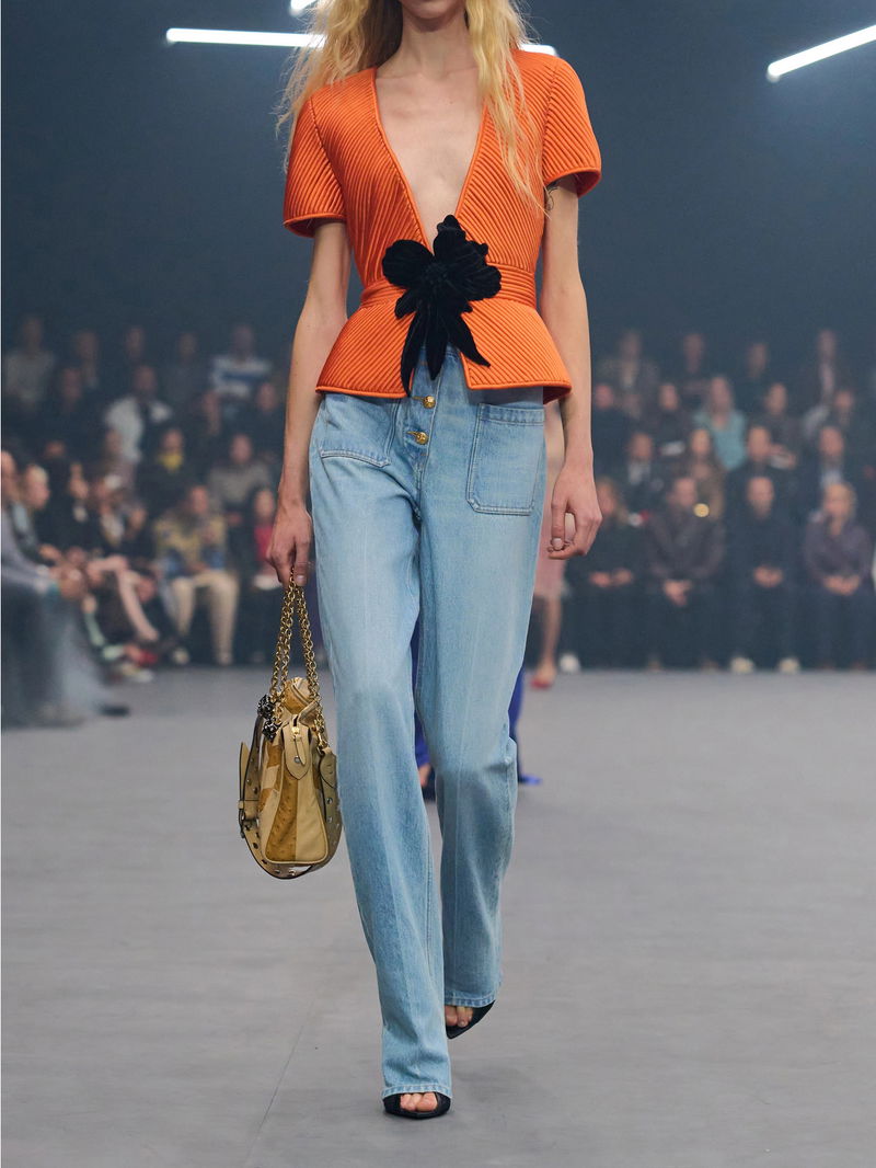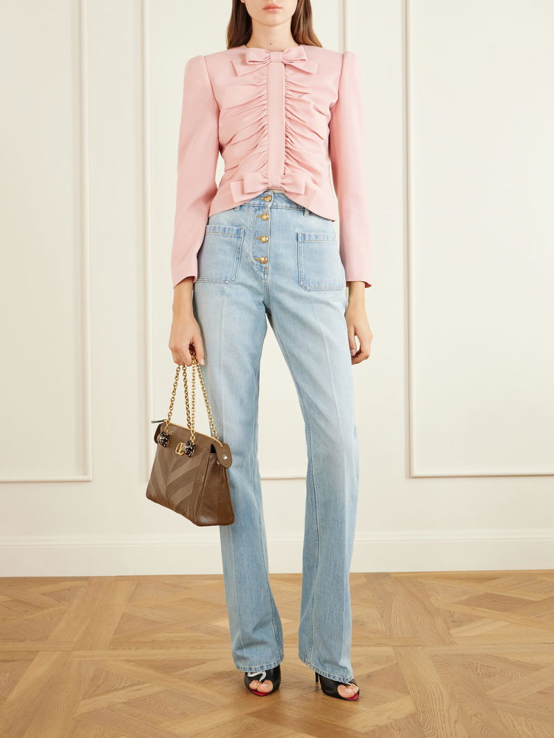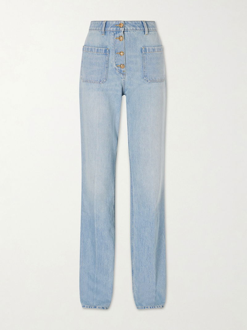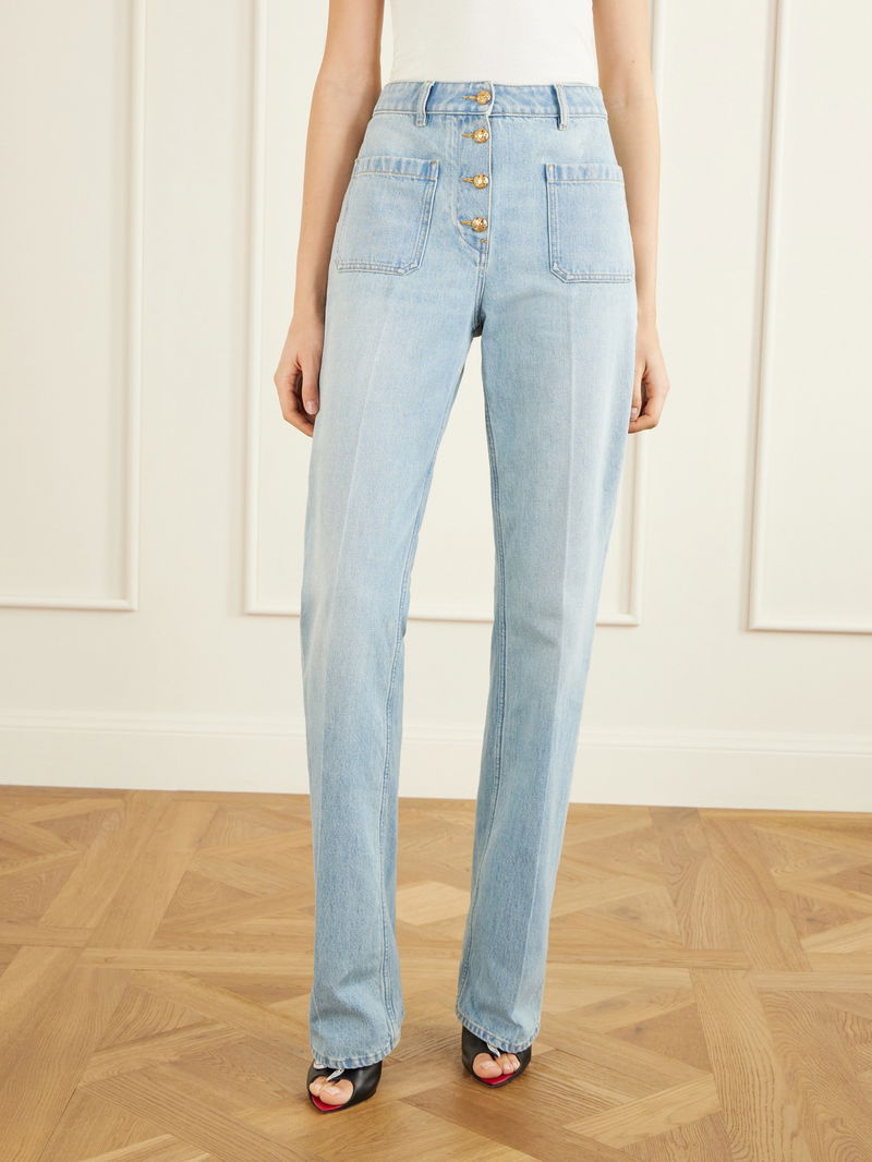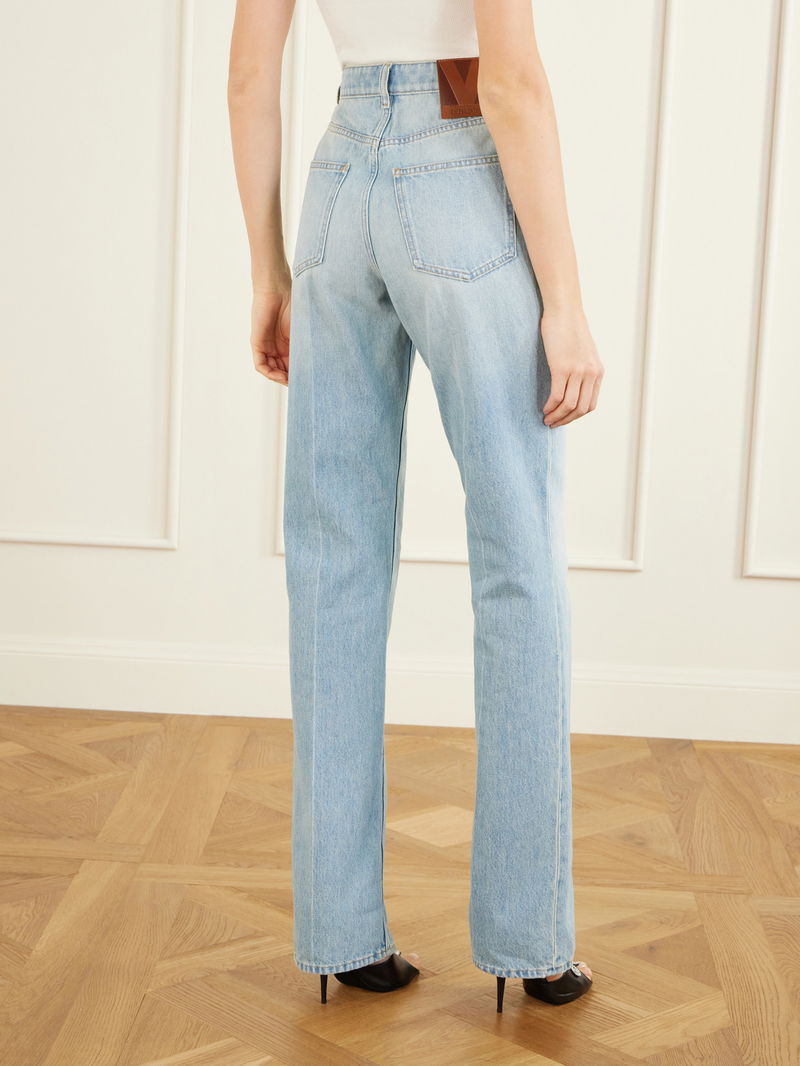 Valentino Garavani combines classic tailoring with modern casual sophistication in these jeans. They sit high at the waist with pressed creases straight-legs for a structured silhouette, while patch pockets at the front and back add subtle detail, balancing contemporary style with timeless wearability.
