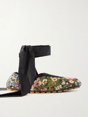 Valentino Garavani's ballet flats unexpectedly borrow elements from soccer shoes. Made from perforated leather, they have thick taffeta ribbons that coil around the ankle to make a voluminous bow. They're set on pebbled soles with elastic inserts for a sporty feel.