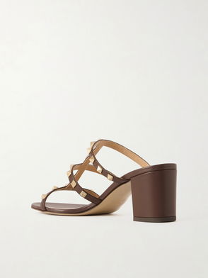 Valentino Garavani leather mules. Open round toe, strappy design at front, VLogo hardware at front, mid-heel.
