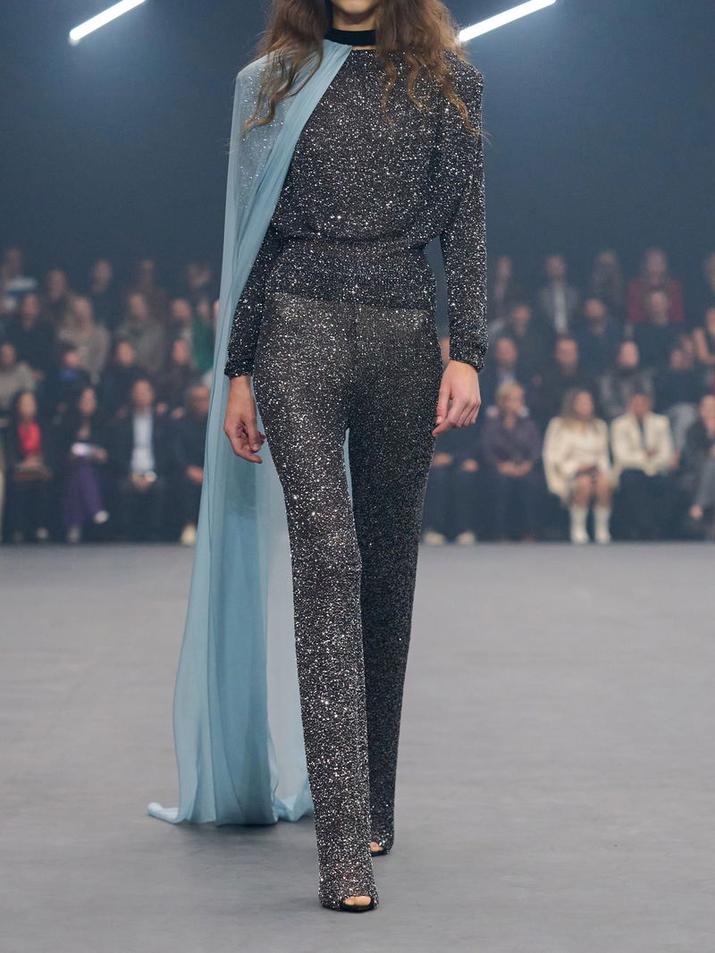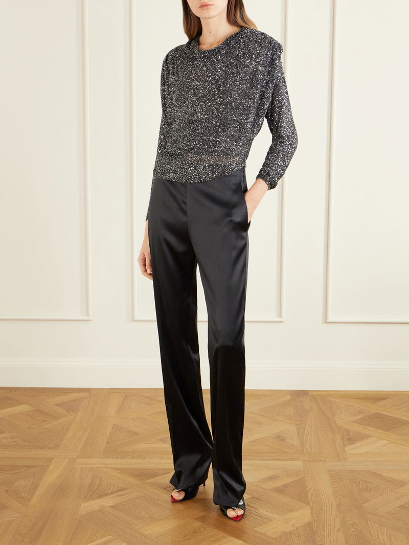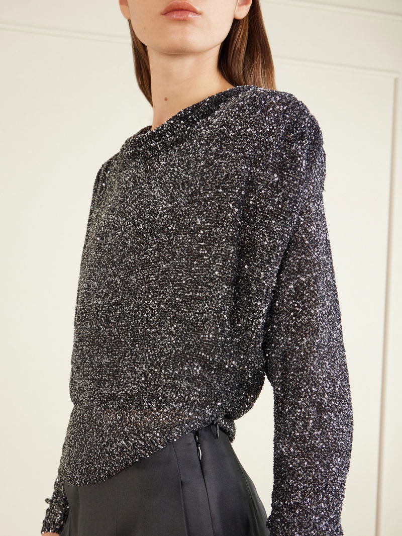 Valentino Garavani pairs couture craftsmanship with striking, modern silhouettes in this blouse. Crafted from lace densely embellished with shimmering sequins, it catches the light with a luminous texture. Padded shoulders balance the relaxed fit, while a softly draped neckline adds fluidity to the design.
