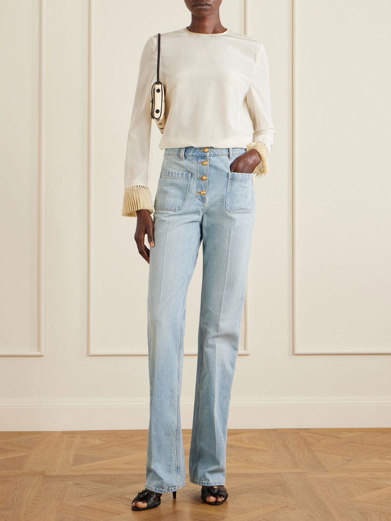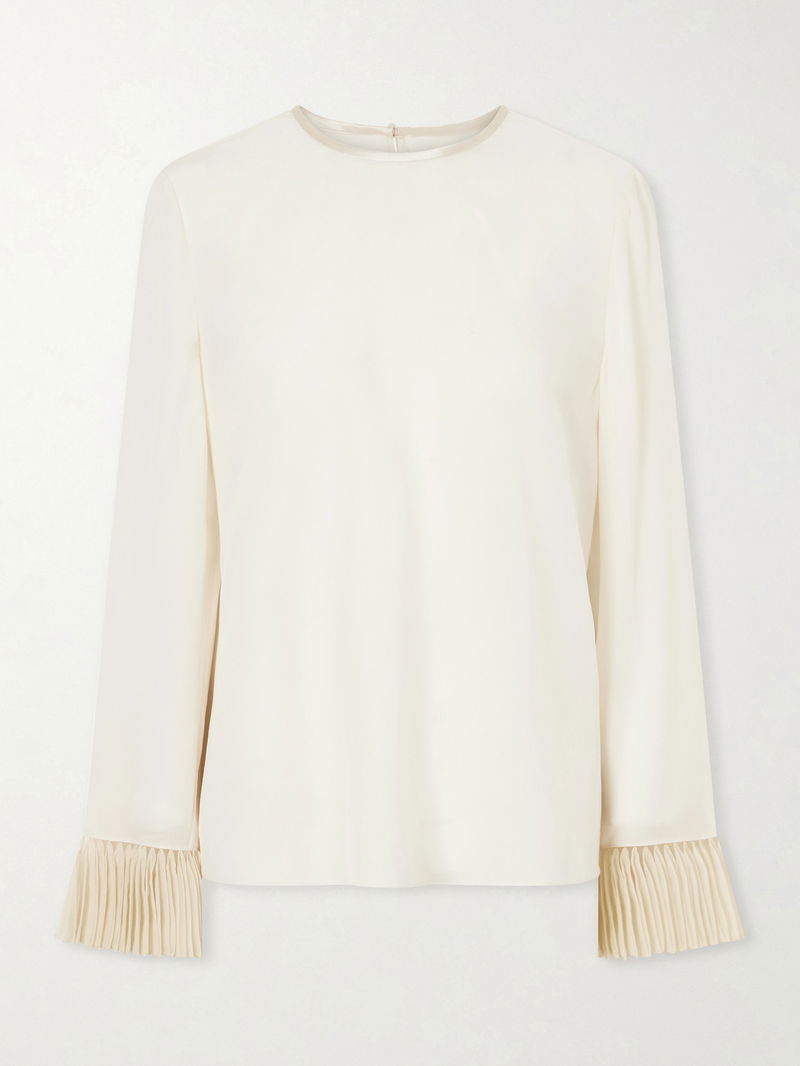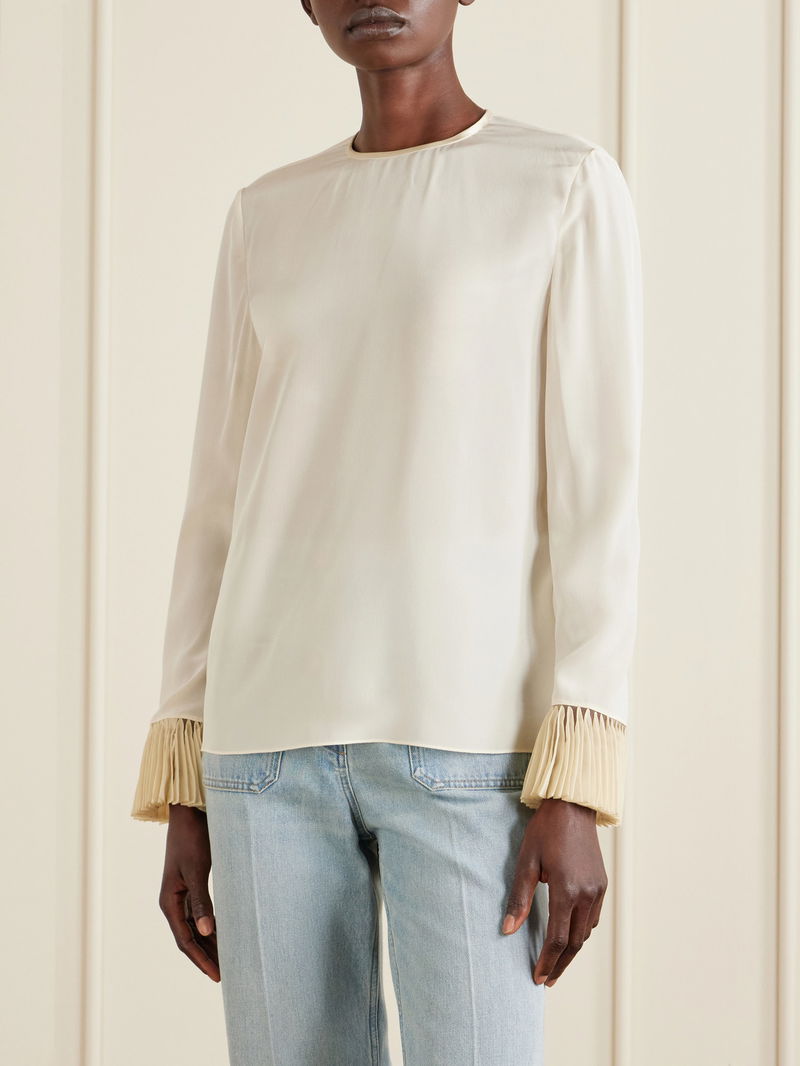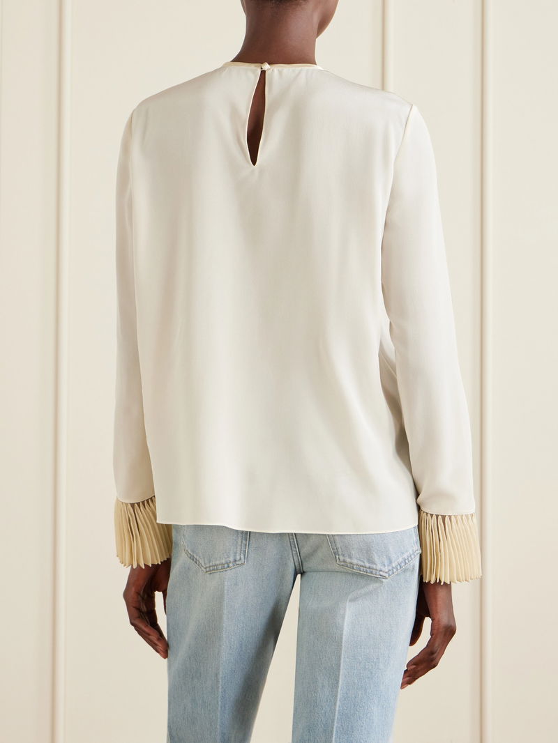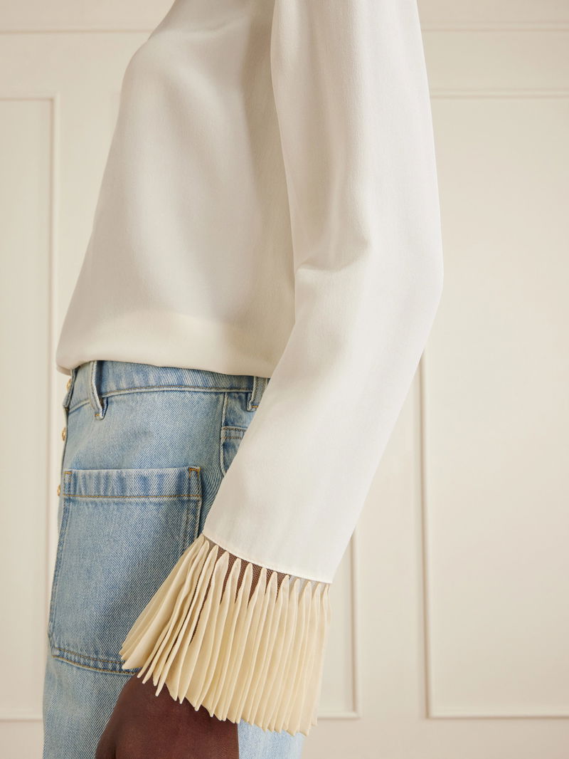 Valentino Garavani’s romantic craftsmanship is evident in this delicate blouse. Cut from fluid silk crepe de chine, it’s finished with beautifully ruffled trims. Style it with jeans or a pencil skirt, depending on the occasion.