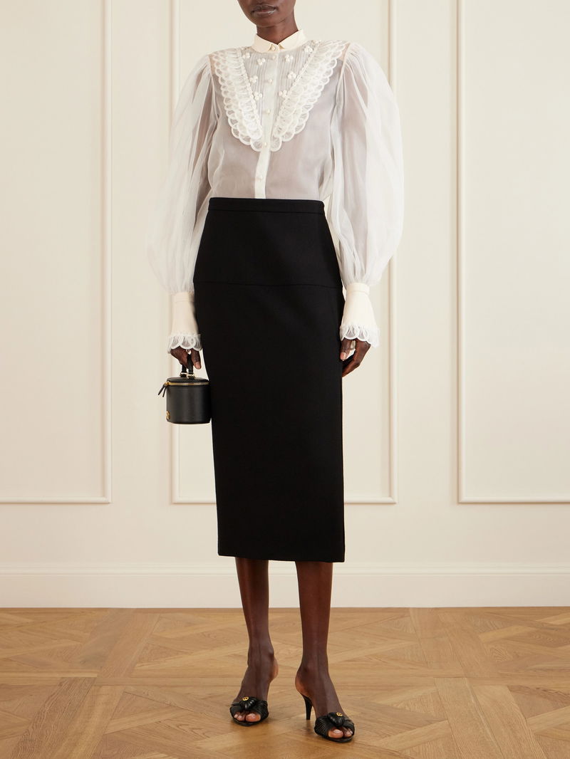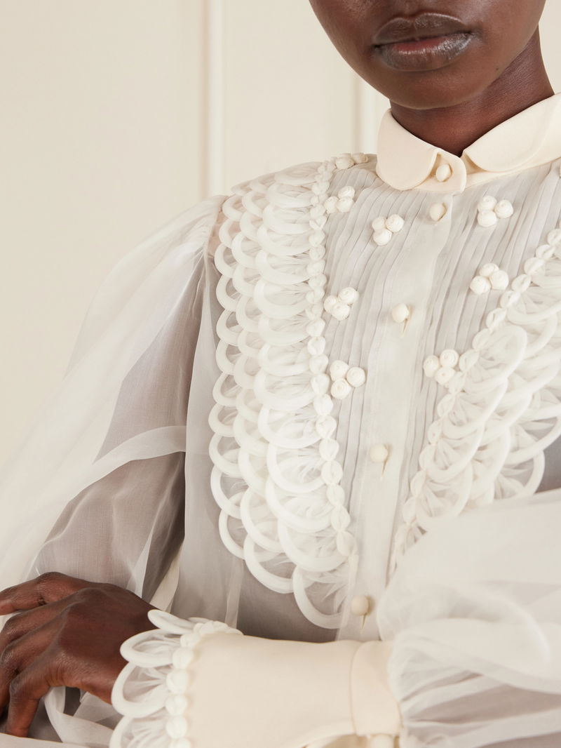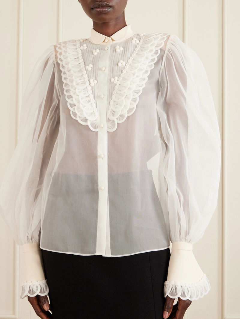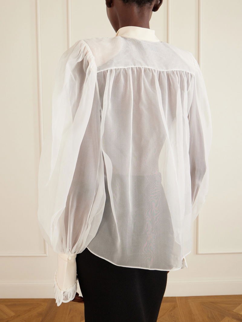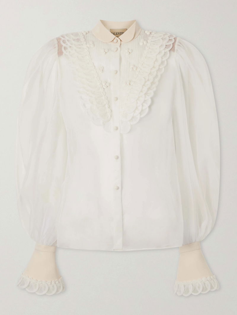 The silhouette of Valentino Garavani's blouse recalls Renaissance menswear shirts. Crafted from silk organza, it is detailed with subtle ruffles tracing a V-shape along the front and gathered cuffs that create puffed sleeves. Style yours with balloon pants and ballet flats.