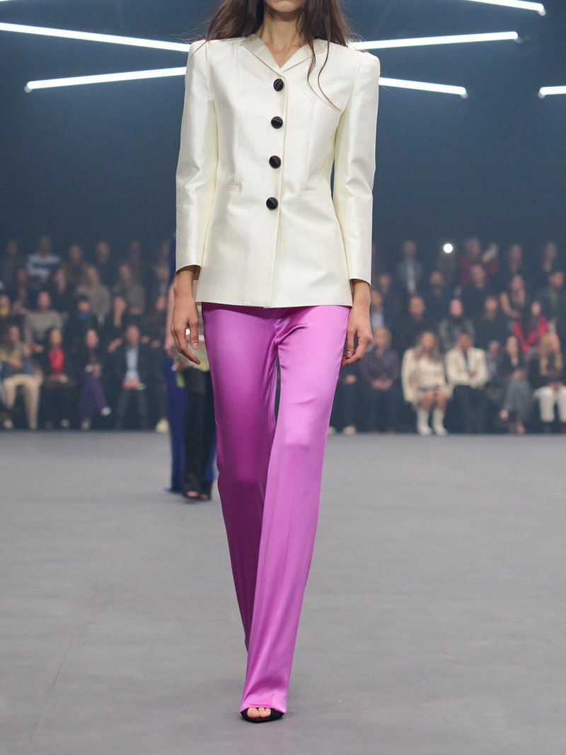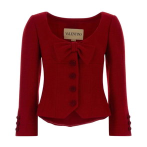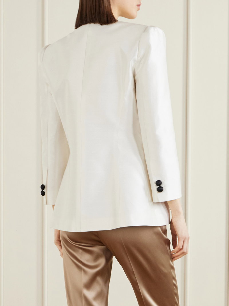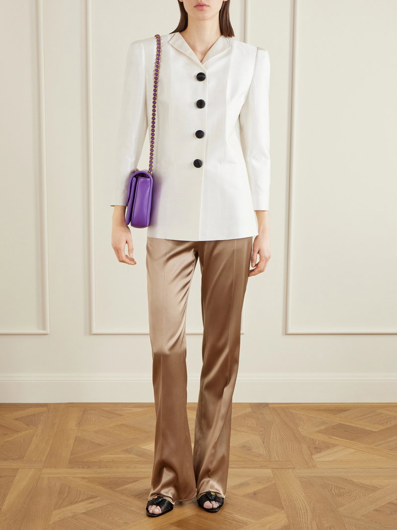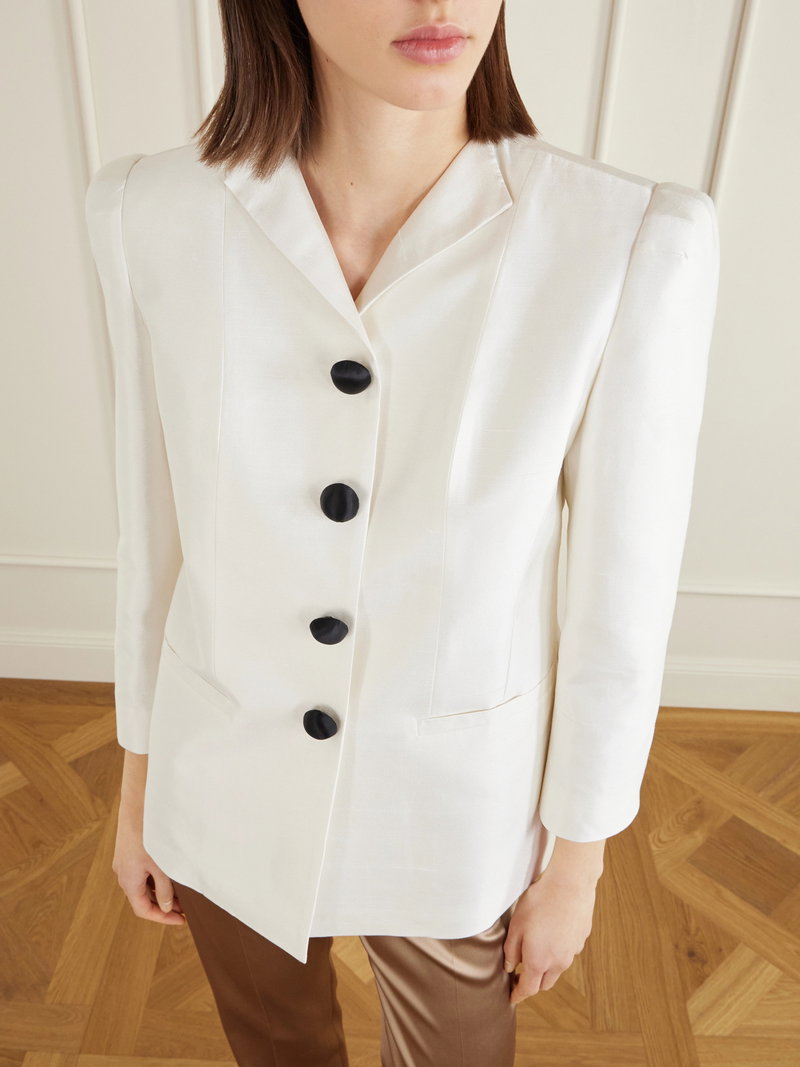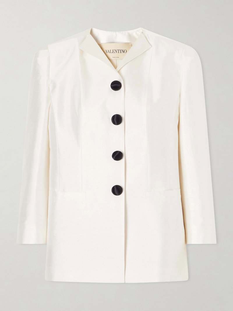 Tailored from silk-shantung, this jacket is shaped with broad shoulders, a cinched waist and voluminous sleeves.