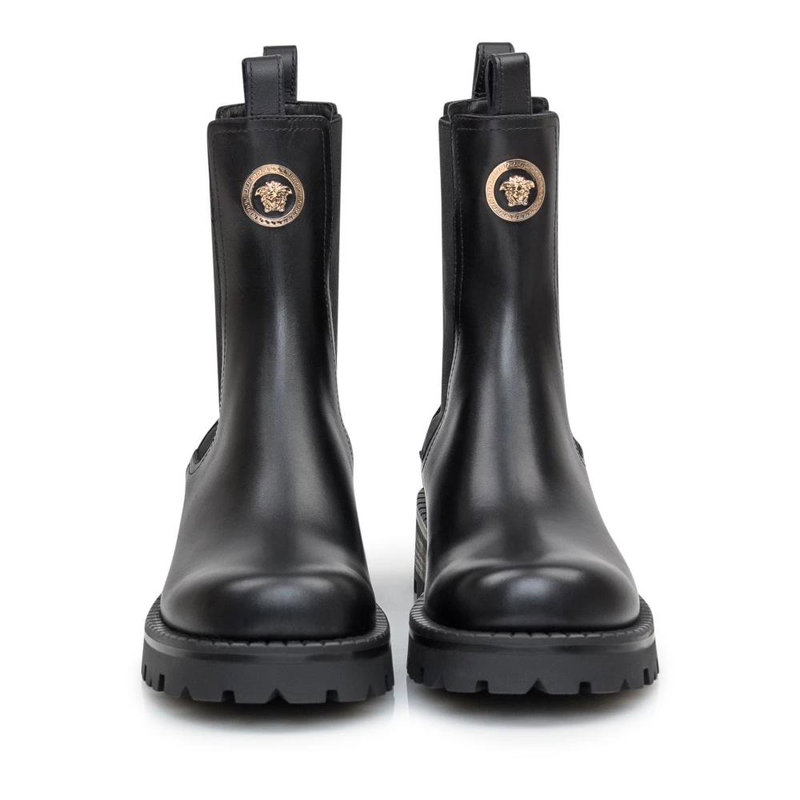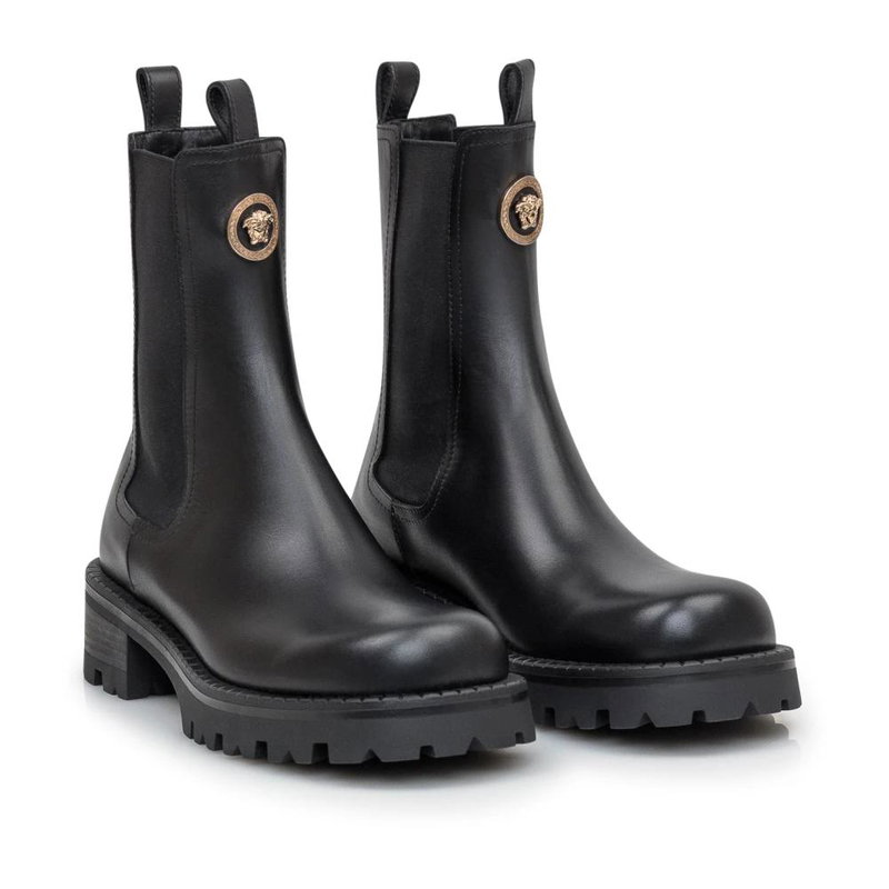 Versace Alia Chelsea Boots pair a classic Chelsea silhouette with a standout golden Medusa emblem, ideal for elevated everyday and smart-casual looks.