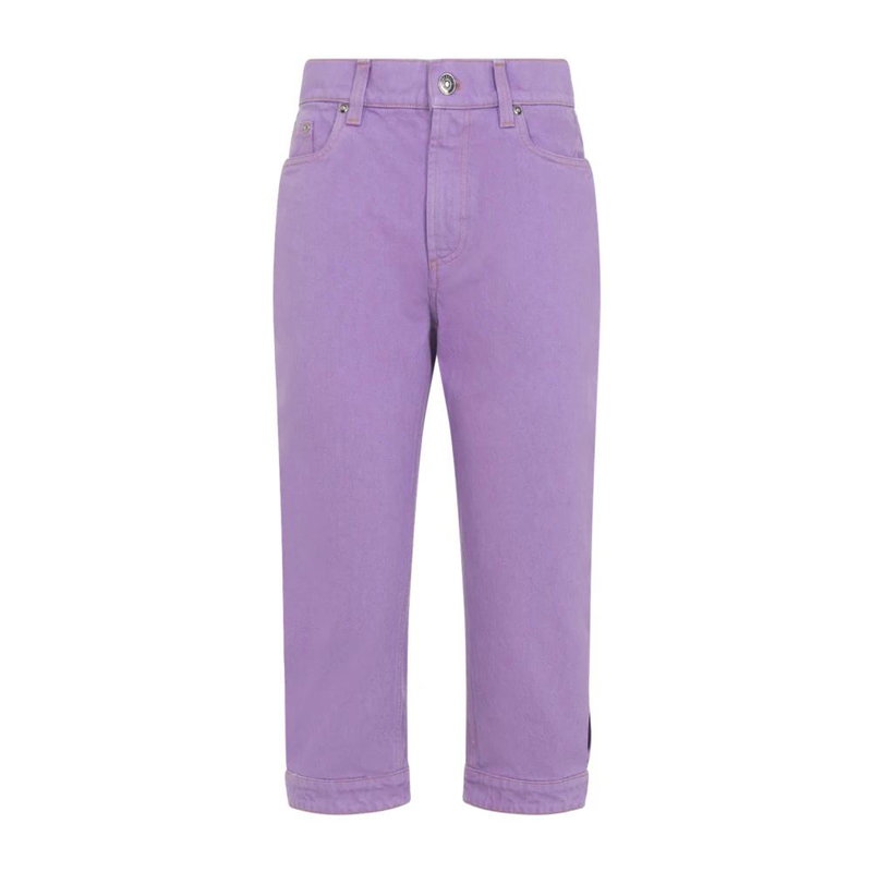 Versace Capri Jeans in lilac cotton offer a knee-length capri silhouette with signature Medusa hardware and a leather logo patch. Designed for casual, elevated styling, they work well with sandals or sneakers for daywear.