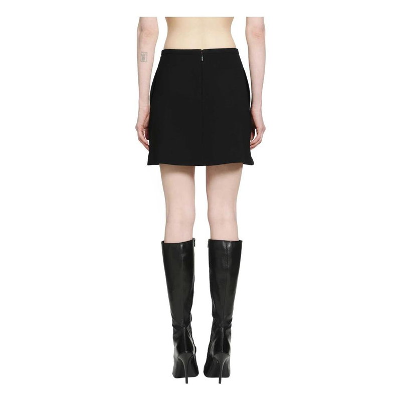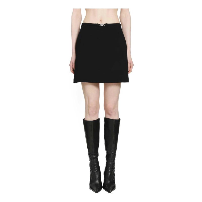Versace Double-Wool Crepe A-Line Mini Skirt combines tailored structure with a flared silhouette and a signature Medusa plaque at the waistband for a refined statement.