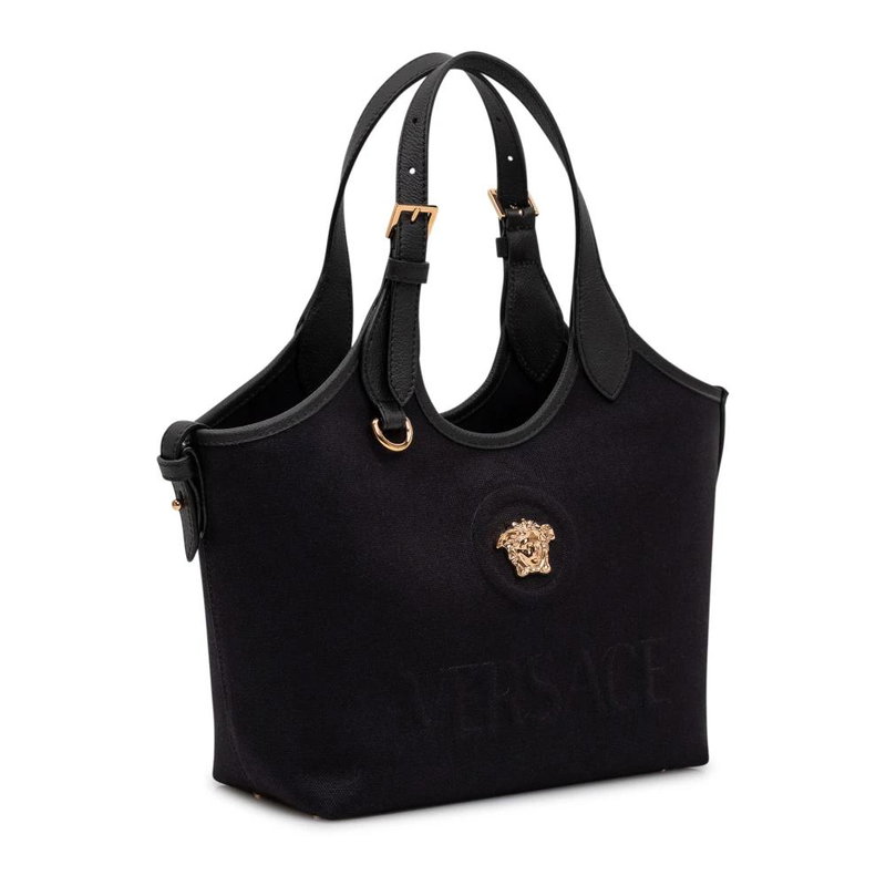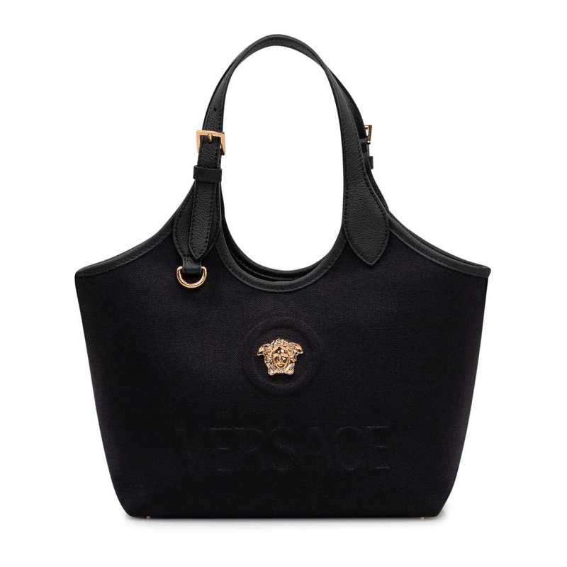 Versace La Medusa Canvas Mini Tote pairs a compact shape with signature La Medusa hardware for everyday carry. The canvas body and leather trims offer a structured, versatile option for in-hand or crossbody wear.