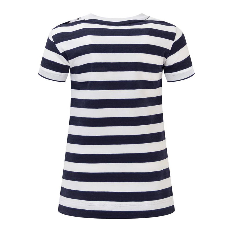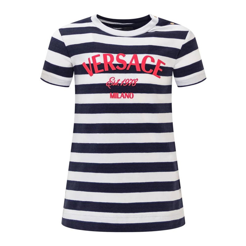 Versace Long Short-Sleeved Dress pairs a bold striped pattern with a crew neck and printed front logo for a polished everyday look. A button closure simplifies dressing while keeping the silhouette clean.