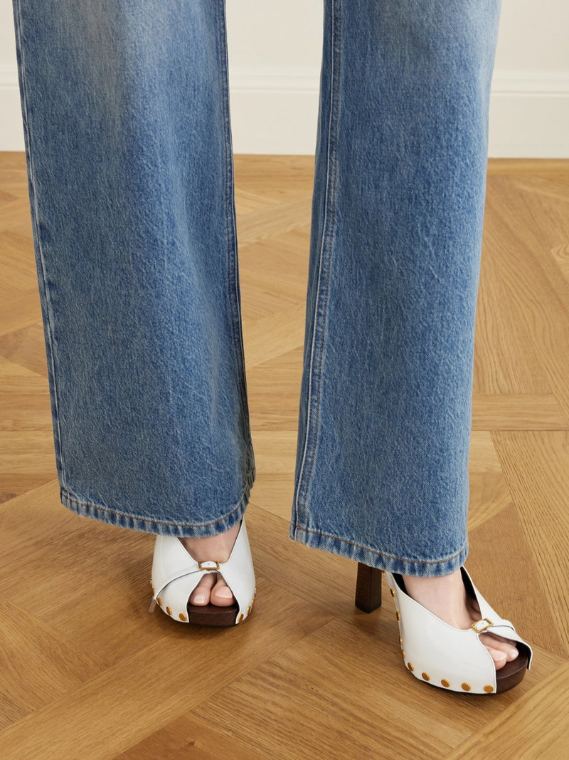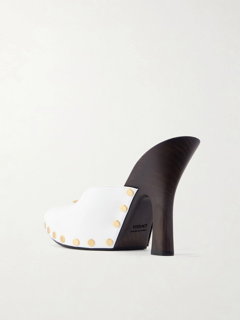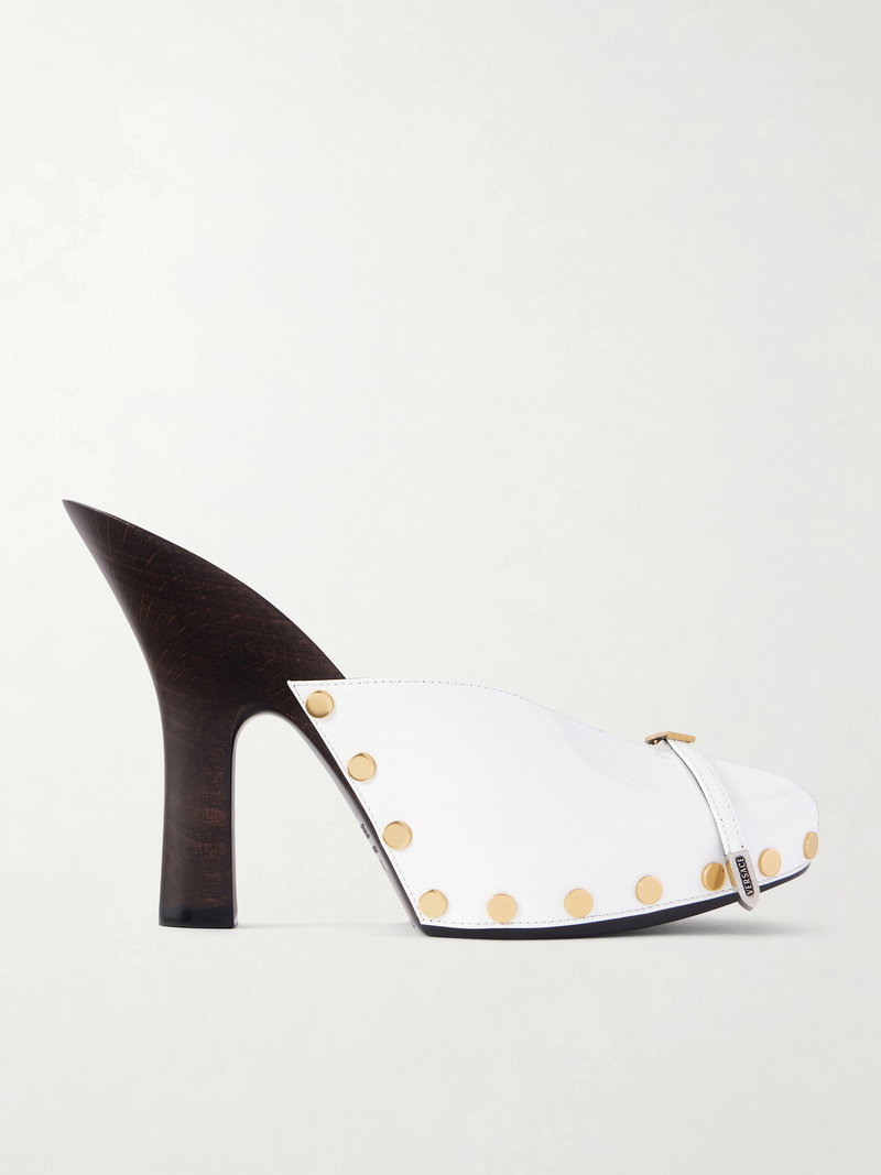 Versace’s “Sassi” clogs reimagine a classic silhouette with signature edge. Crafted from glossy patent leather, they’re studded and set on a sculpted wooden platform. A single buckle strap, tipped with a metal end cap engraved with the house’s logo, secures the fit.