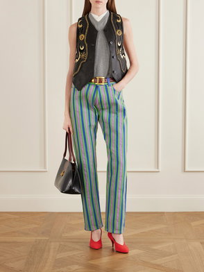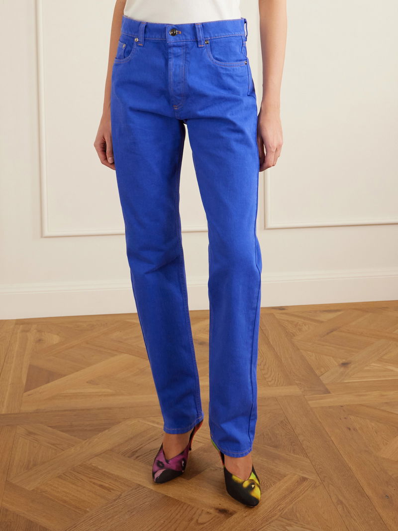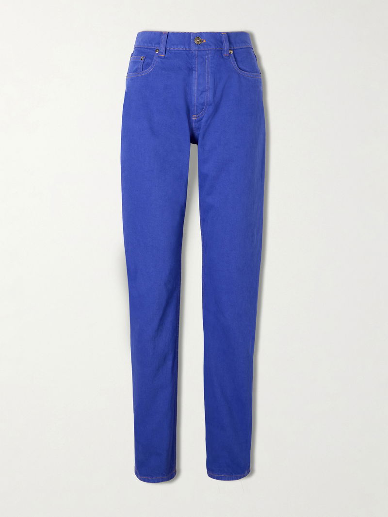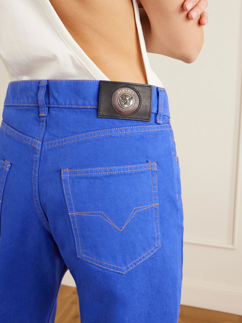 These low-rise straight-leg jeans by Versace are crafted from colored cotton denim and designed with a concealed front button closure and classic five-pocket construction. A leather patch at the back is embossed with the logo and accented by sculptural 3D 'Medusa' hardware.