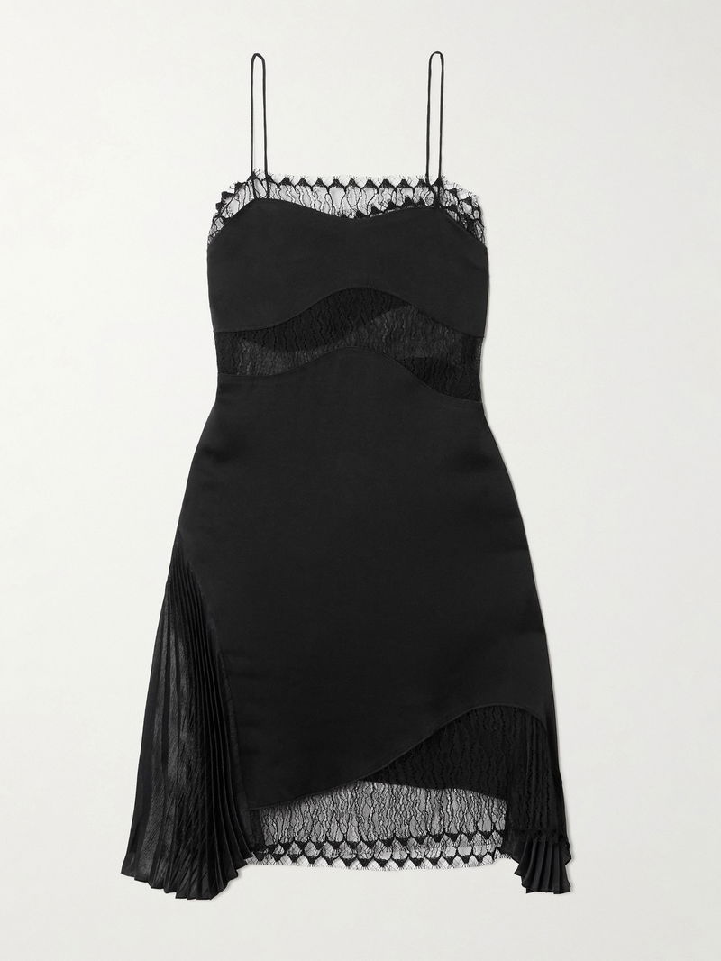 Pleated Chiffon And Lace-trimmed Satin-crepe Mini Dress