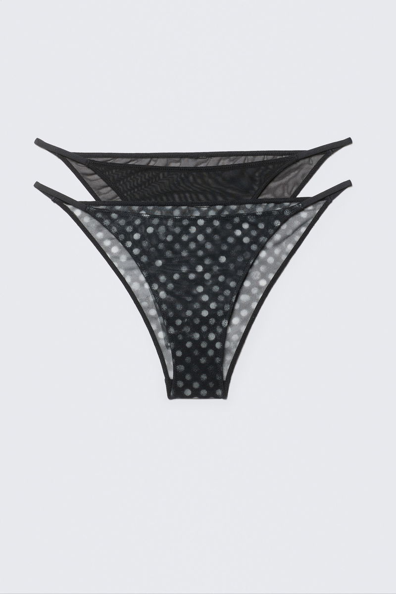 A two-pack of printed, mid-rise tanga Brazilian-cut bottoms crafted from sheer mesh. Designed with a thin elasticated waistband and a cotton lined gusset for added comfort.