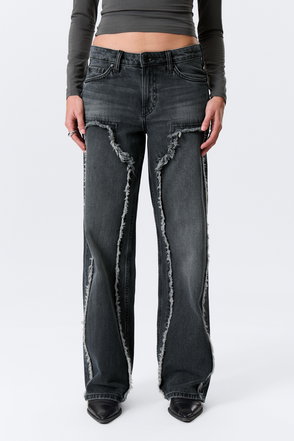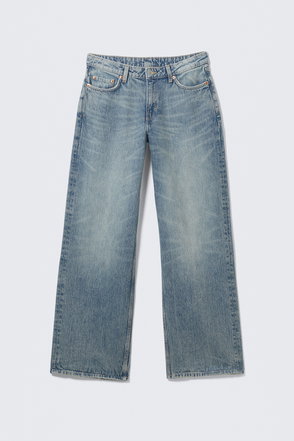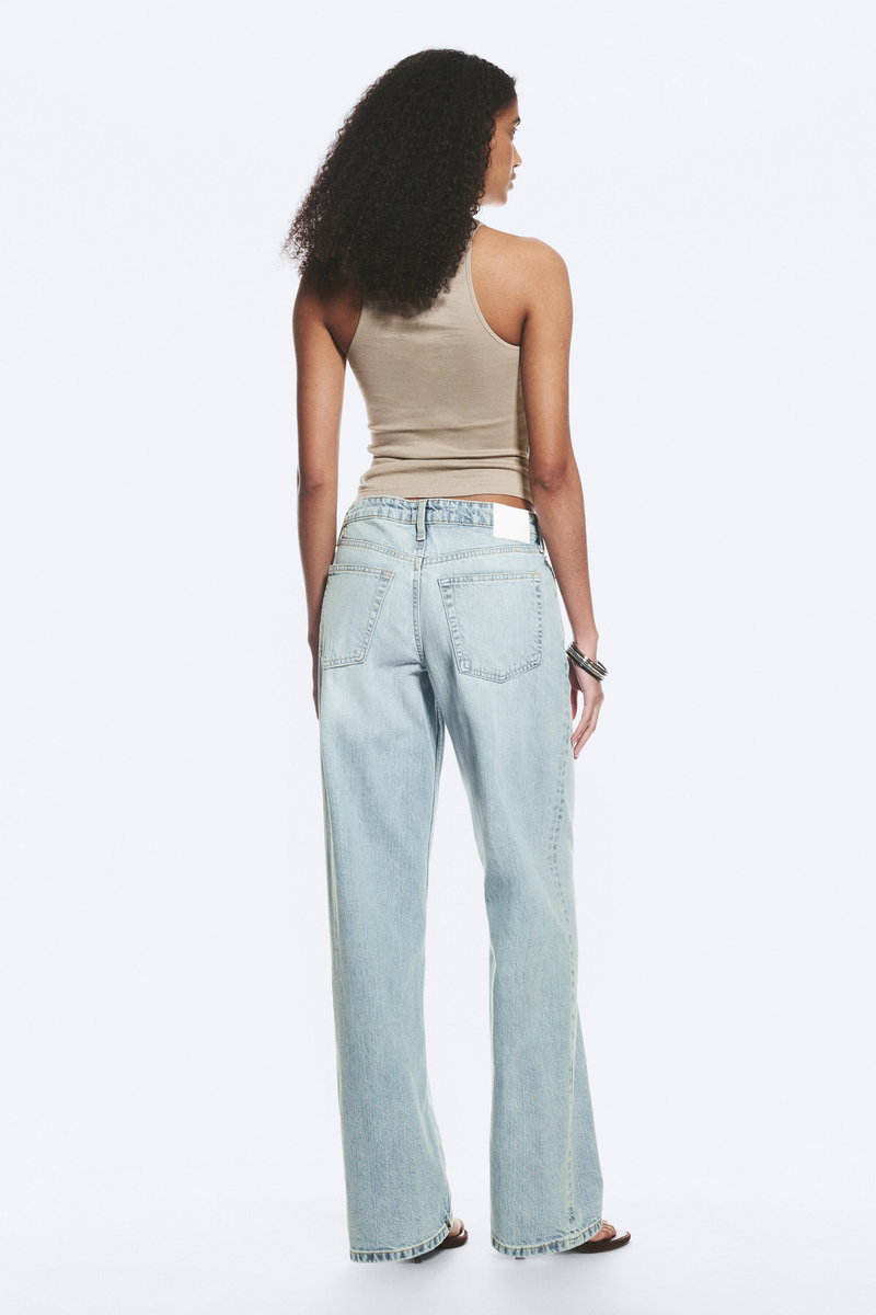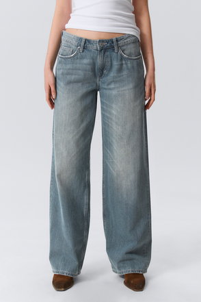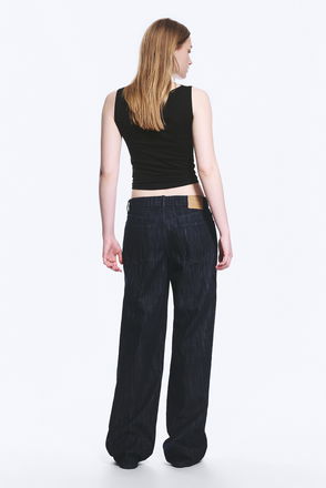 A pair of low rise jeans with a loose fit, wide leg and long length. These jeans are crafted from organic cotton rigid denim enhanced with recycled cotton. They feature a classic 5-pocket design and a zip fly.
