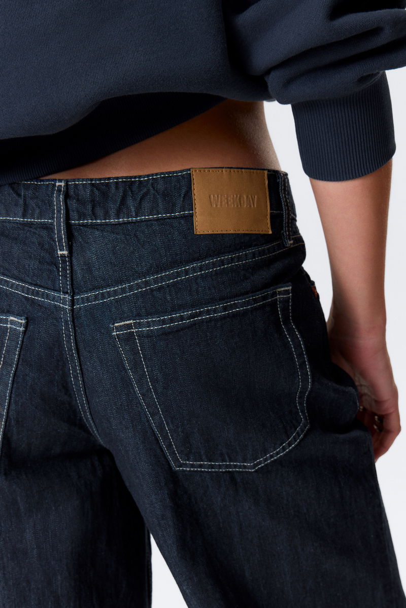 A pair of low rise jeans with a loose fit, wide leg and long length. These jeans are crafted from organic cotton rigid denim enhanced with recycled cotton. They feature a classic 5-pocket design and a zip fly.