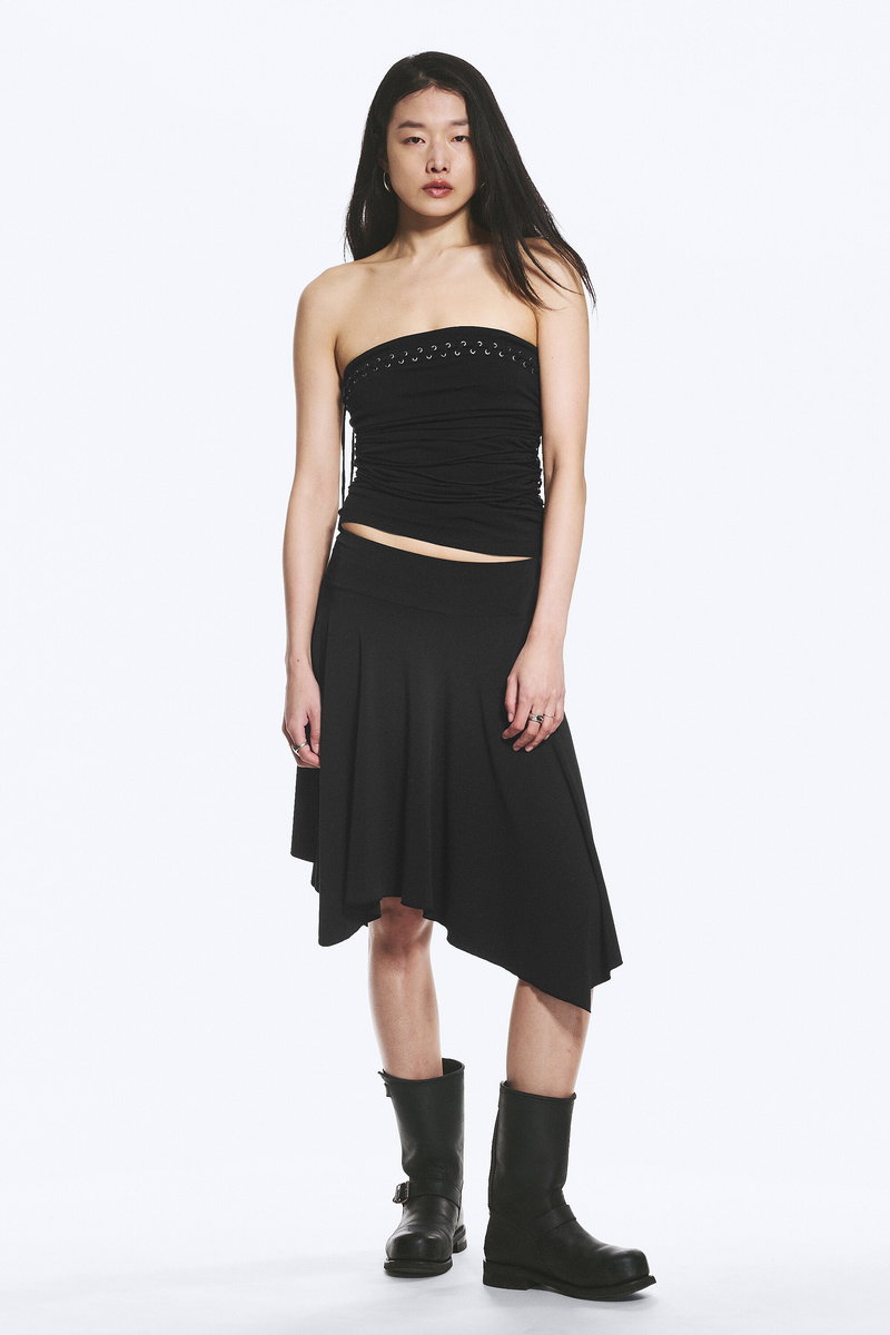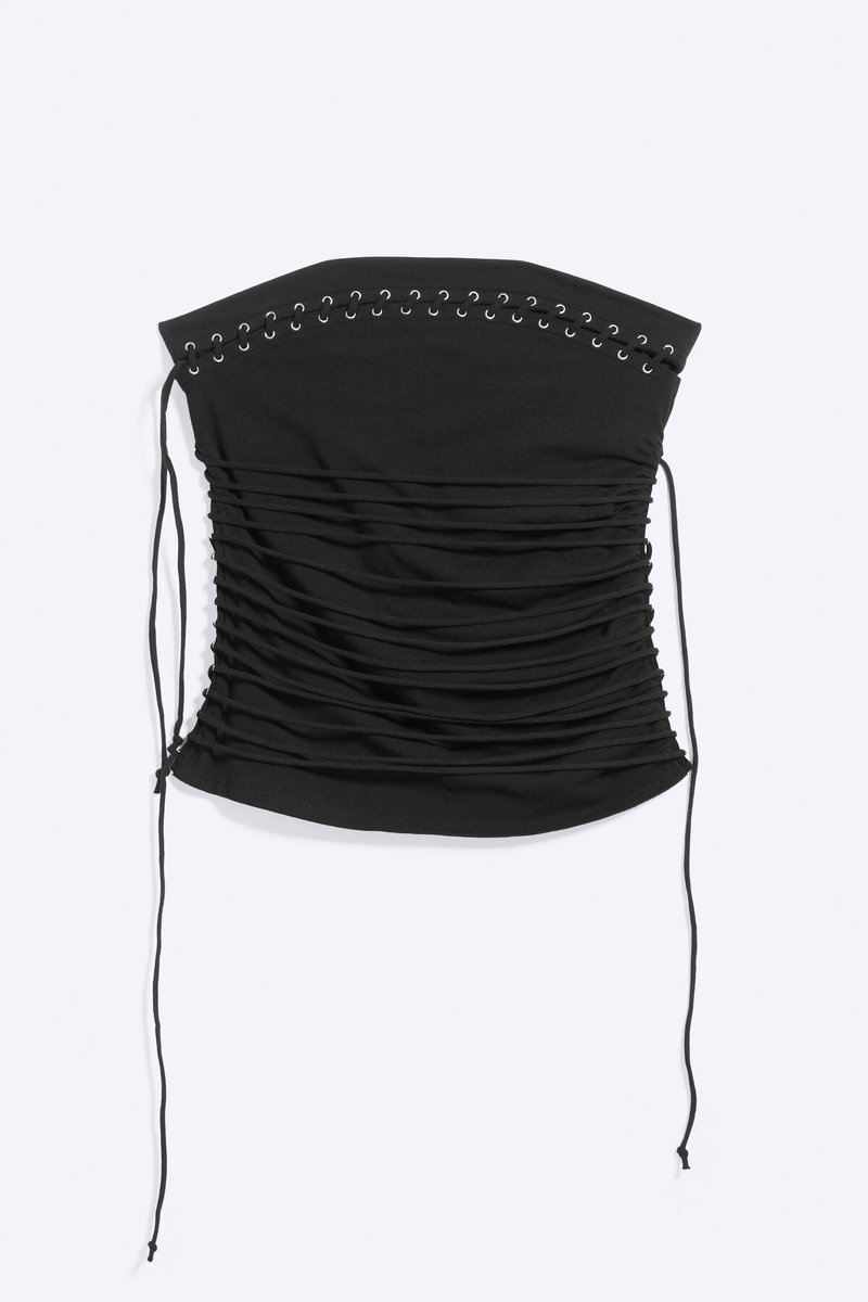 A tube top crafted from soft cotton jersey. Designed with a strapless, fitted silhouette, it features corset inspired tie detailing that runs across the body and around the top hem, creating adjustable gathers and a laced look from every angle.