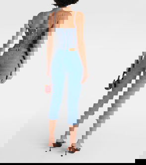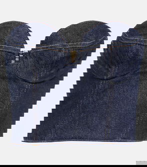 A standout denim bustier top with a slim fit, crafted from an organic cotton rigid denim enhanced with recycled cotton. It features thin adjustable shoulder straps, a folded front top hem, decorative buttonhole stitching along the side and back top hem, and a metal back zip closure.