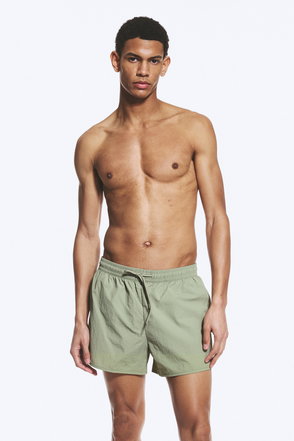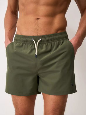 A pair of classic swim shorts made from a soft and lightweight recycled polyester. They have side slit pockets, an elasticated drawstring waistline, and are lined with a soft sporty mesh.