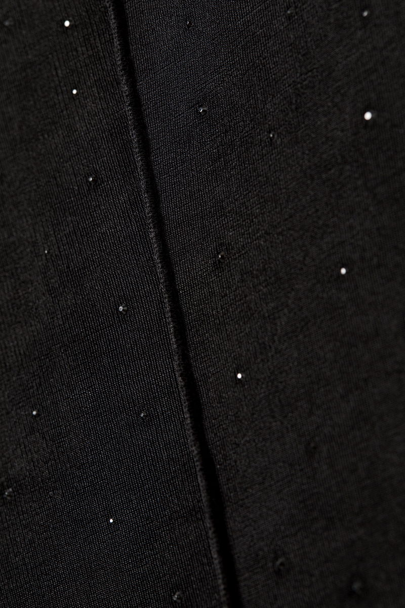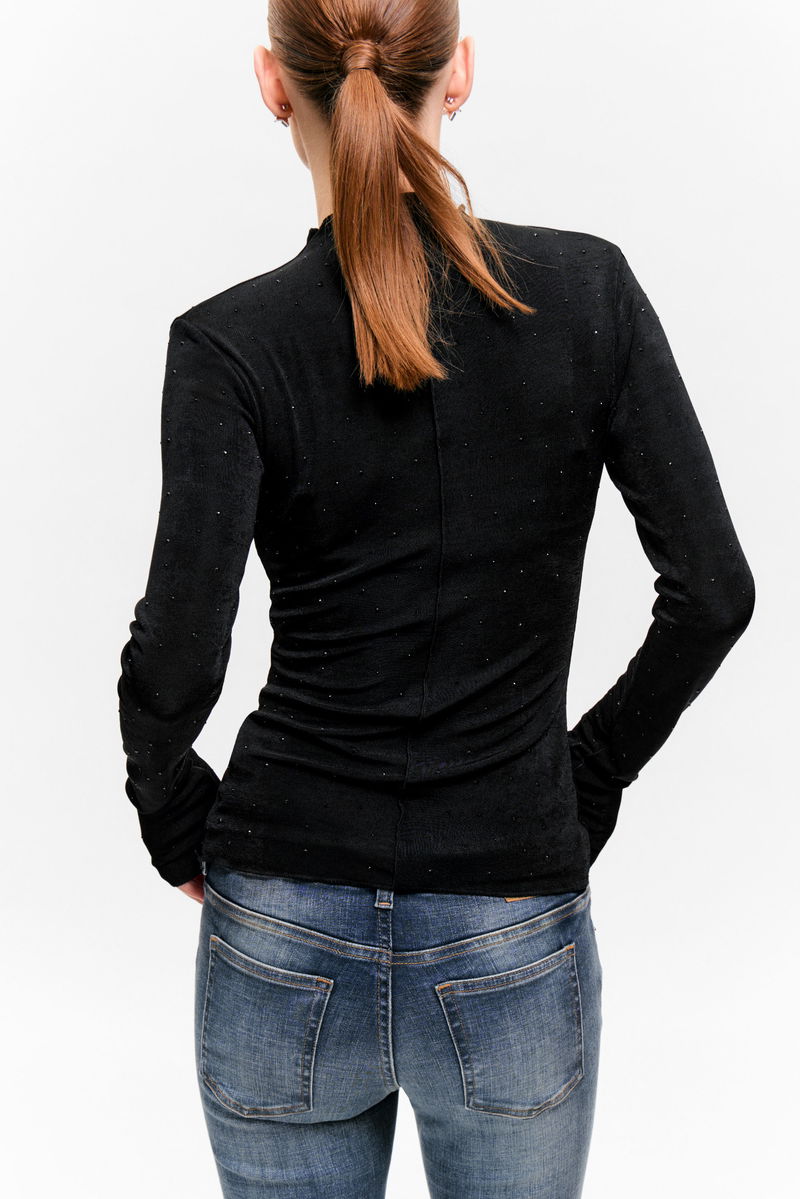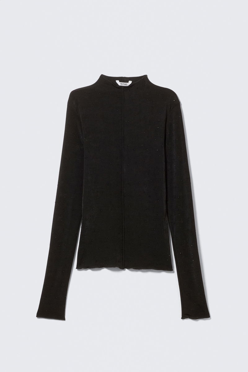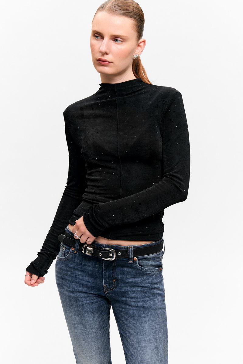 A slim-fitting long sleeve top crafted from semi-sheer, stretchy jersey. It features monochrome all-over rhinestone embellishments that add texture and a hint of shine. Designed with a mock neck, front and back centre seams, and a straight hem.