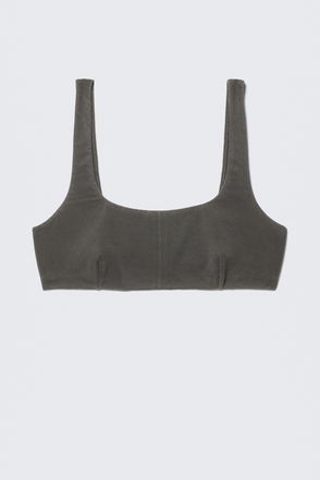 A low supporting mesh triangle bra with lace trims crafted from recycled polyamide enhanced with recycled elastane for all day comfort. It features adjustable spaghetti straps, darted cups, and a hook and eye back closure.