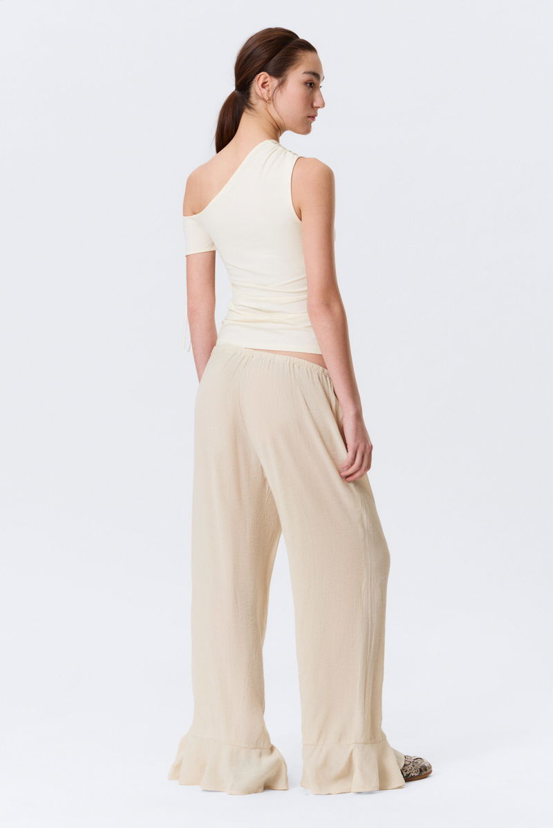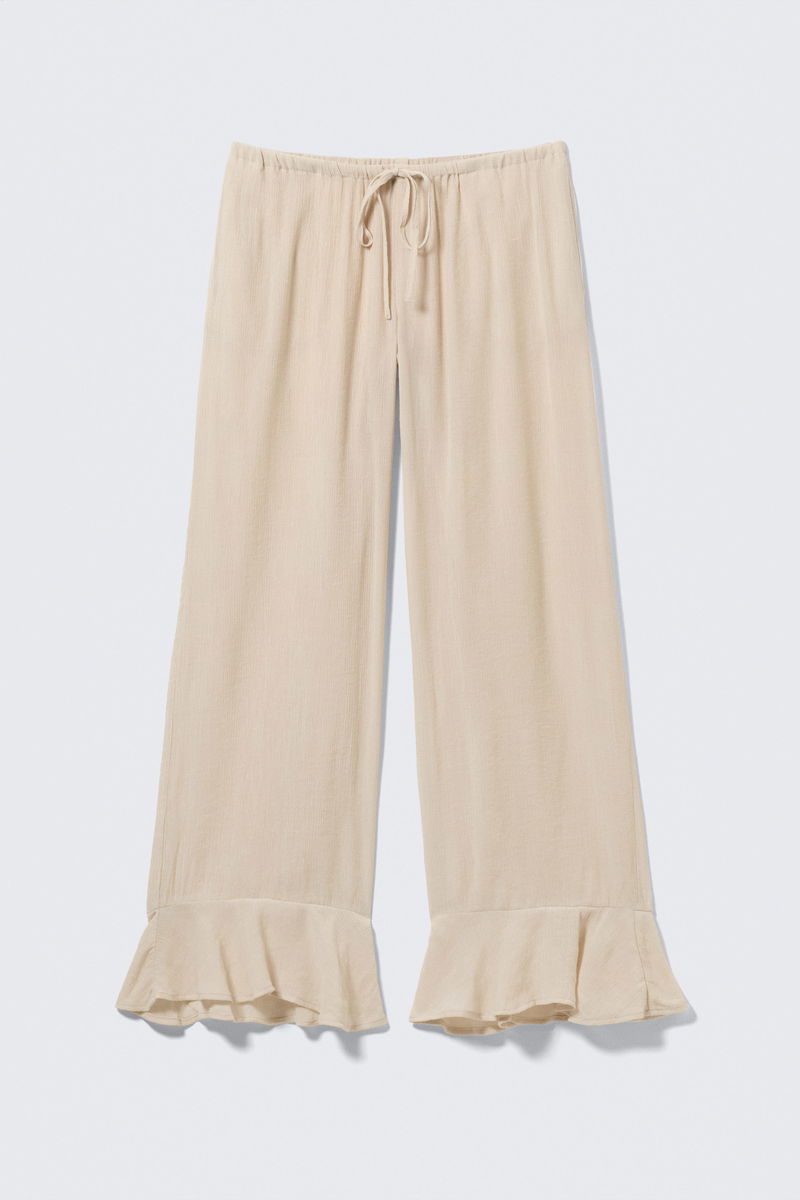 A pair of mid-rise trousers with a loose fit, crafted from lightweight woven fabric with a crinkled texture.